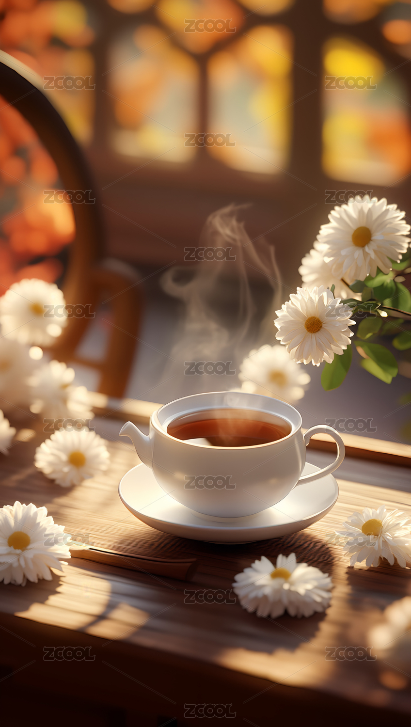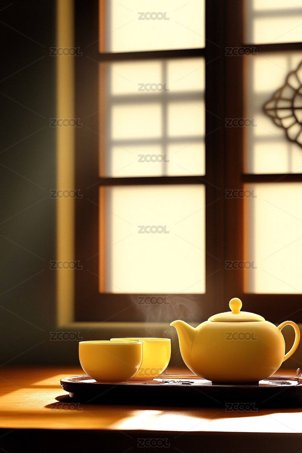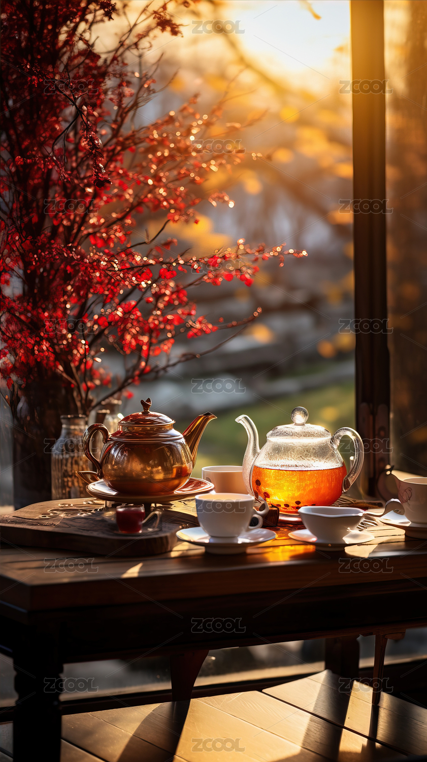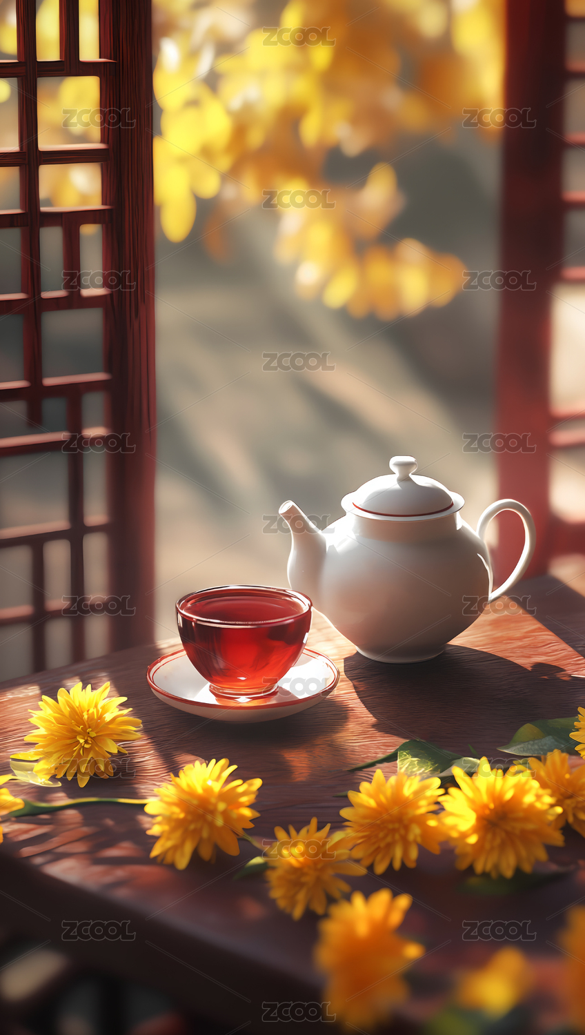 茶杯,茶壶,中式,中国风,复古,庭院,园林,窗框,窗户,秋天