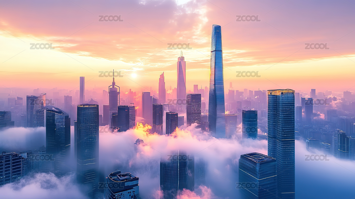 城市,高塔,云雾,晨曦,现代化,高楼大厦,建筑物,山脉,天空,蓝色