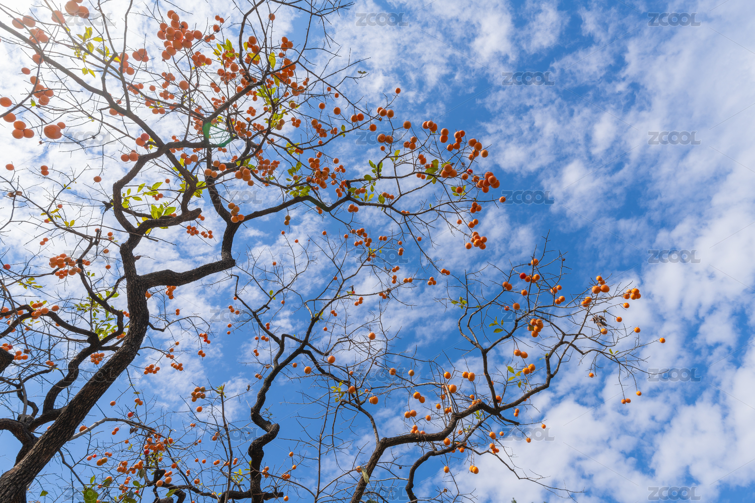 秋天的柿子树枝头挂满成熟的红柿子