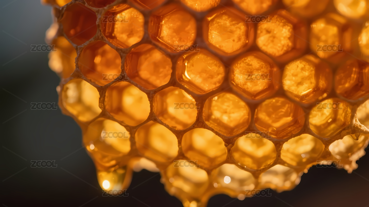 金黄色蜂蜜填满蜂巢六边形格子的特写镜头