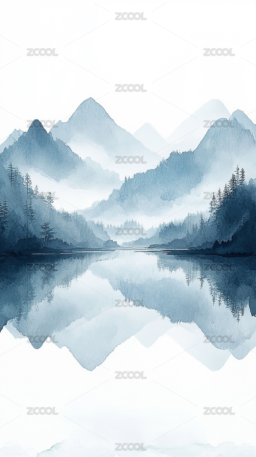 蓝色水墨山川插画背景