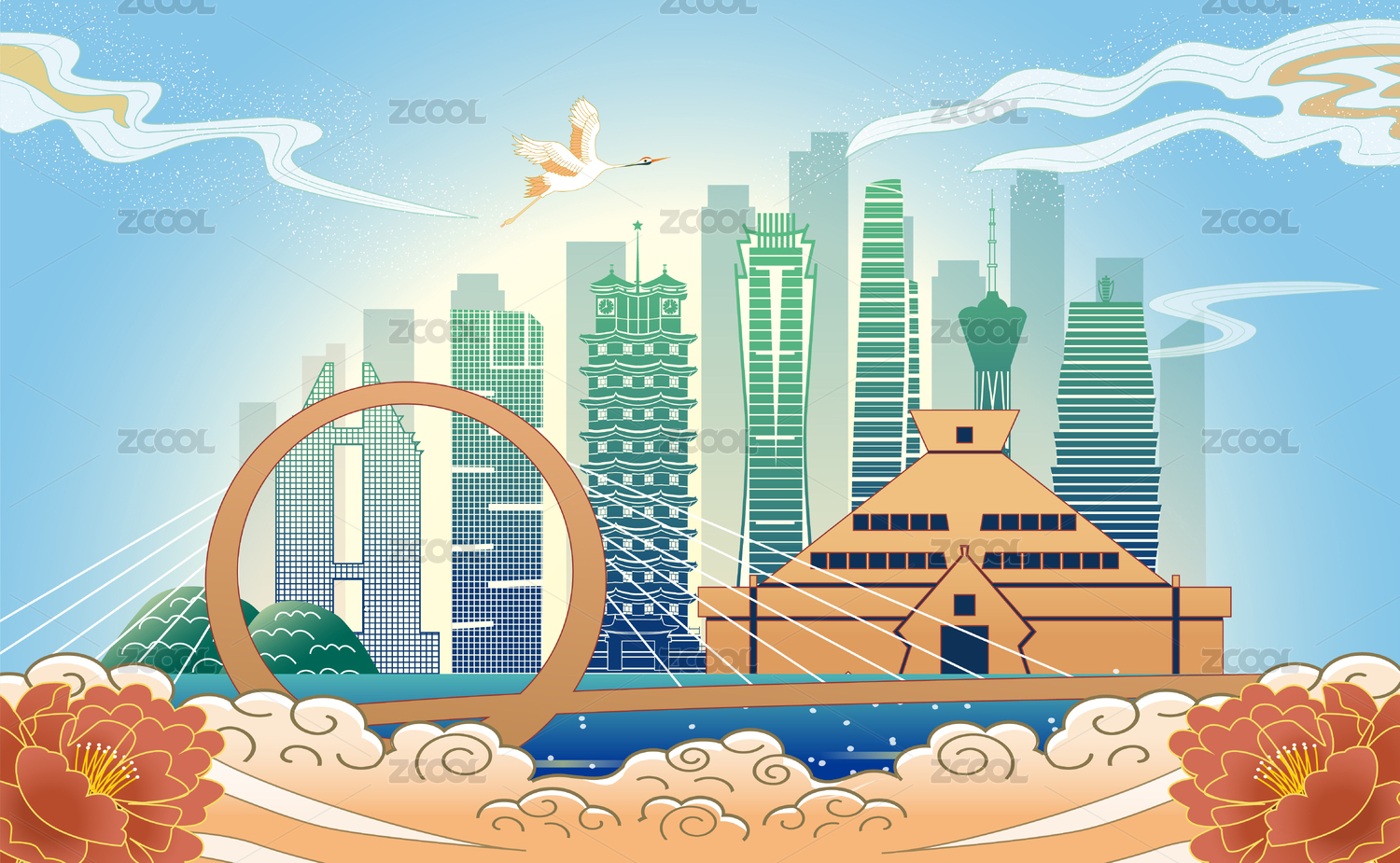 中国广东中山市城市国风海报插画