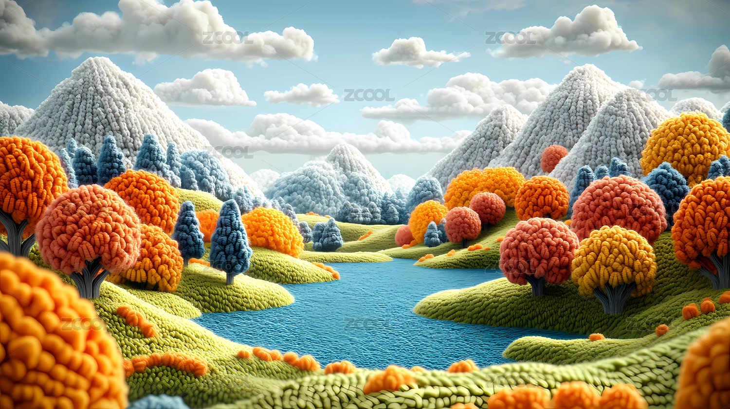冬日温暖粗毛线质感创意瀑布卡通山水画