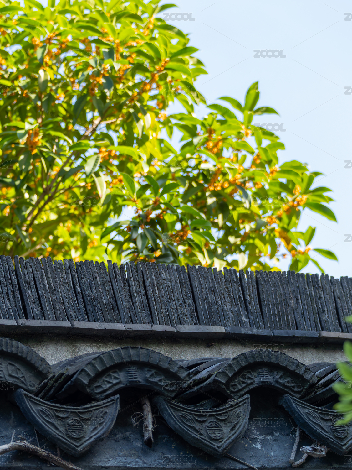 中式屋檐旁的桂花