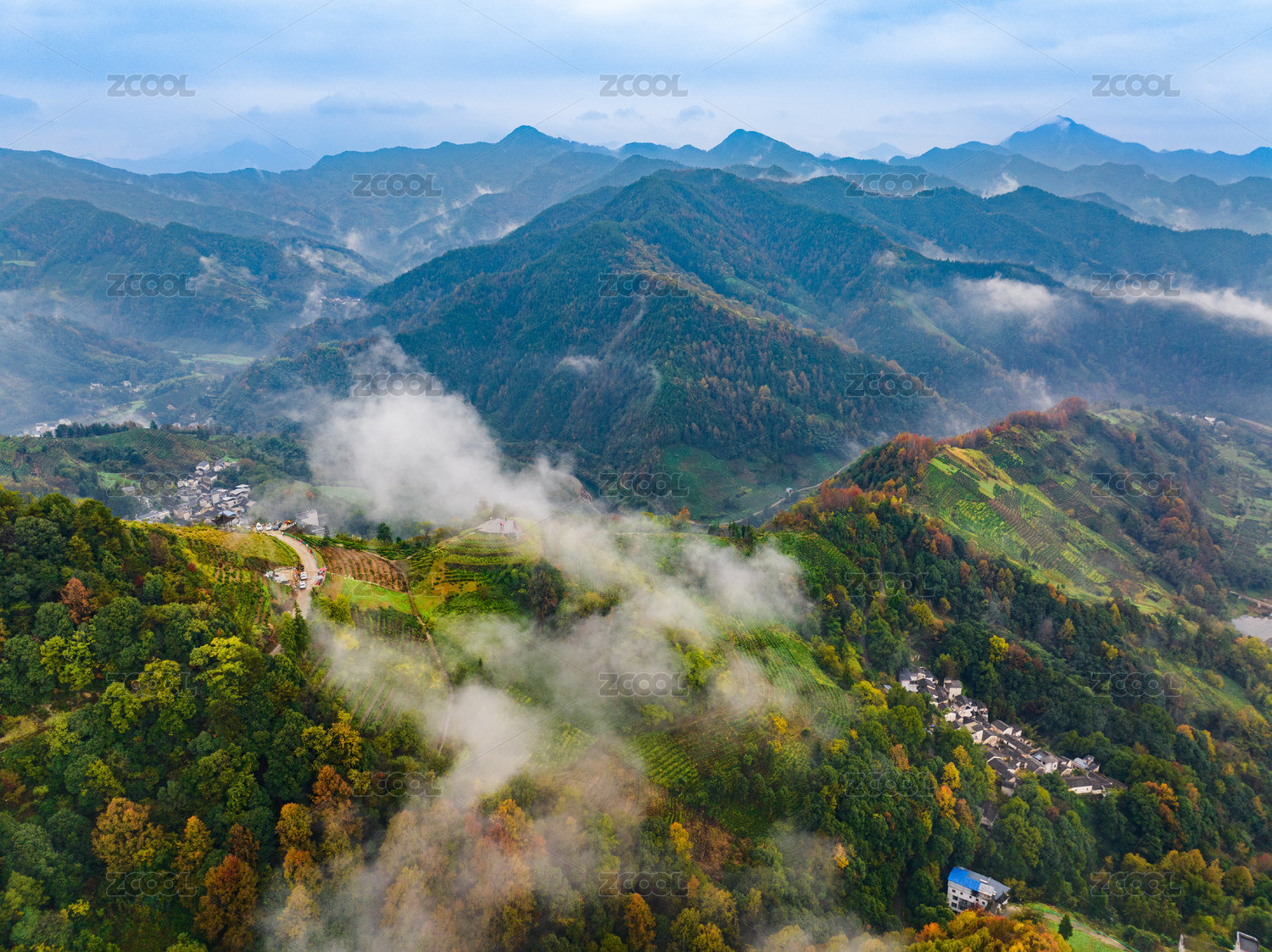 航拍云雾中若隐若现的中国安徽省黄山市歙县石潭