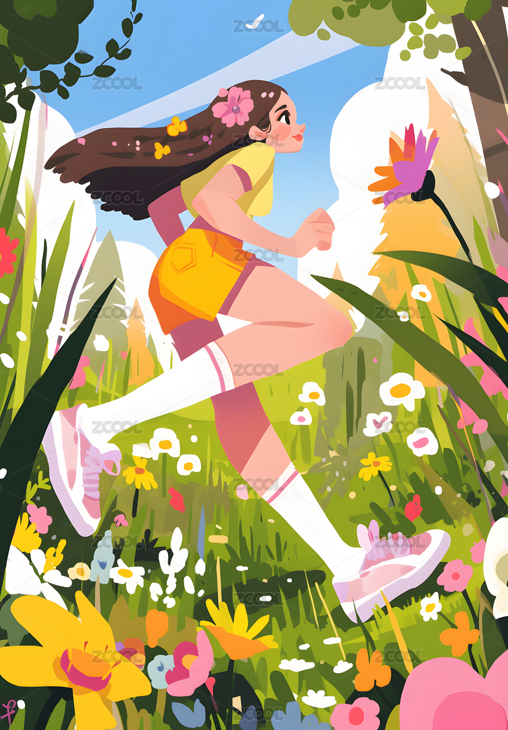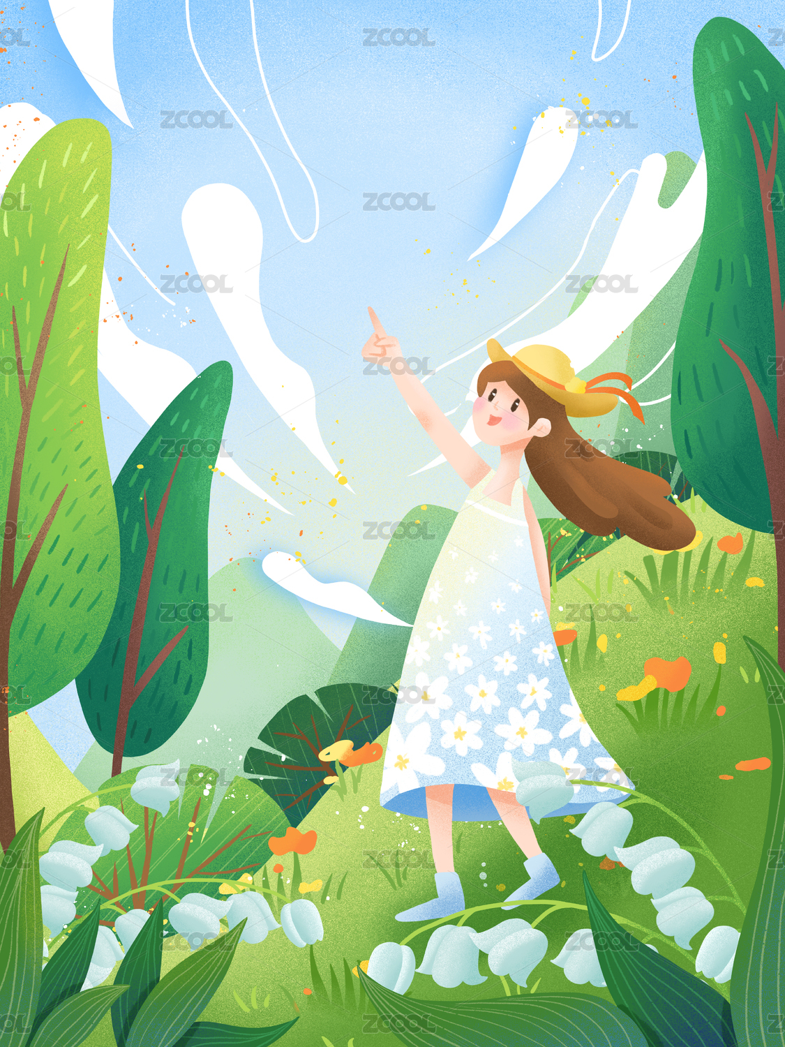 女生在花朵中跳舞手绘插画