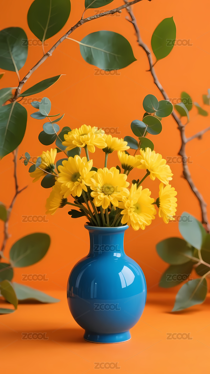 蓝色花瓶与黄色花朵