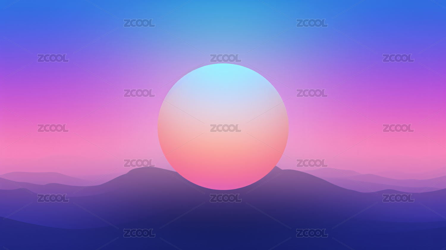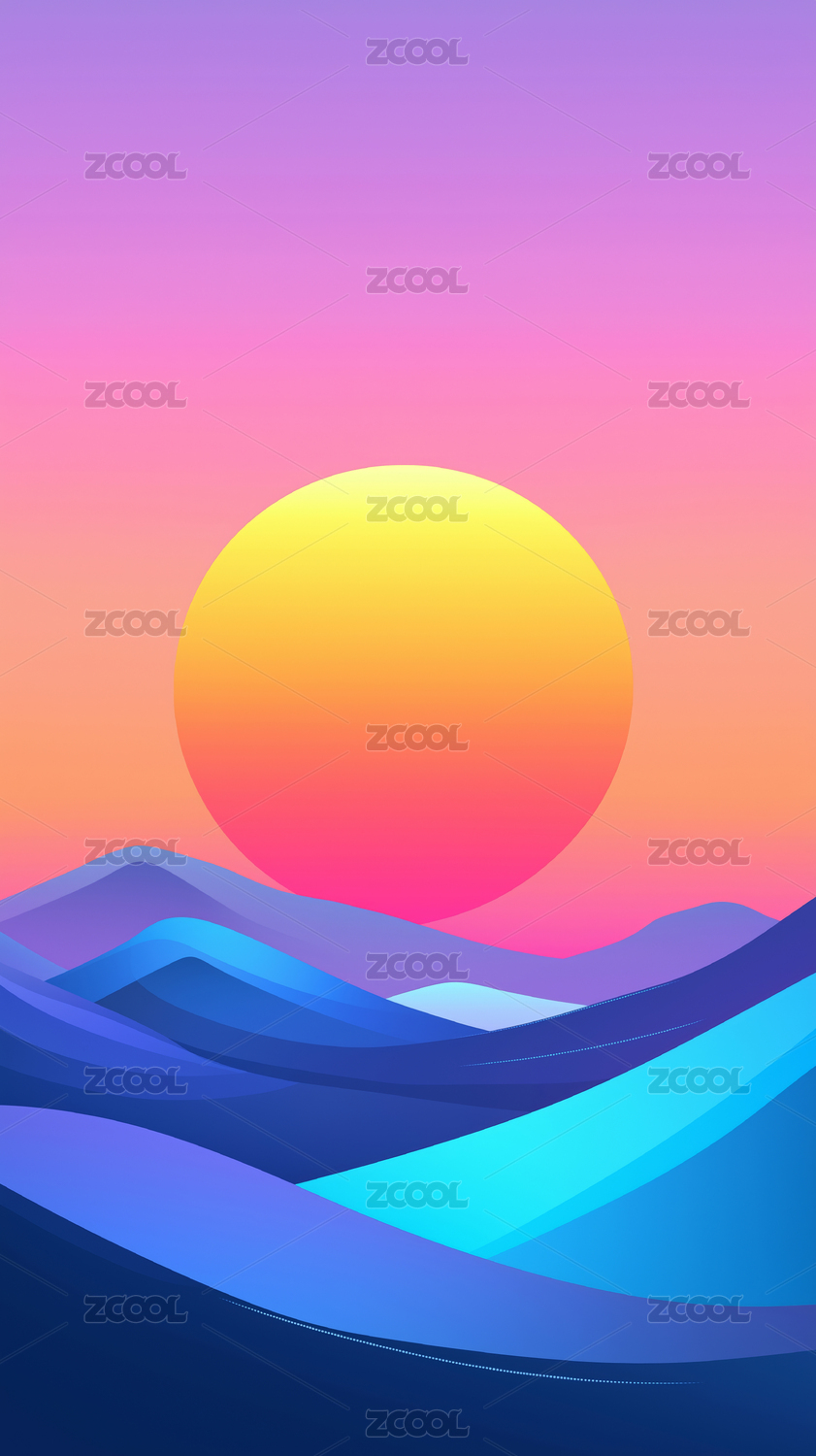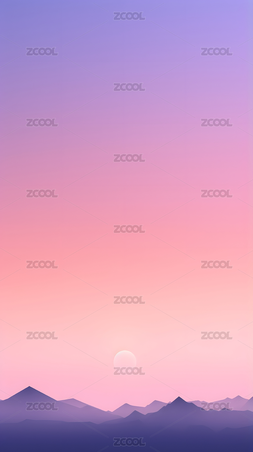 巨大的圆形太阳悬挂在渐变的粉色和紫色天空