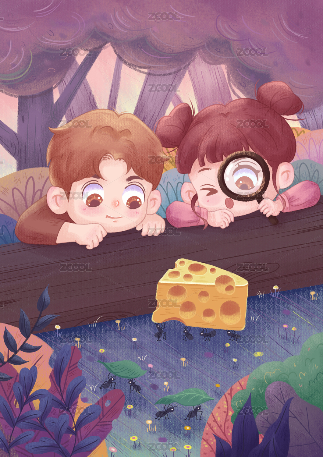 绿色治愈可爱林卡通小女孩和小男孩的咖啡屋