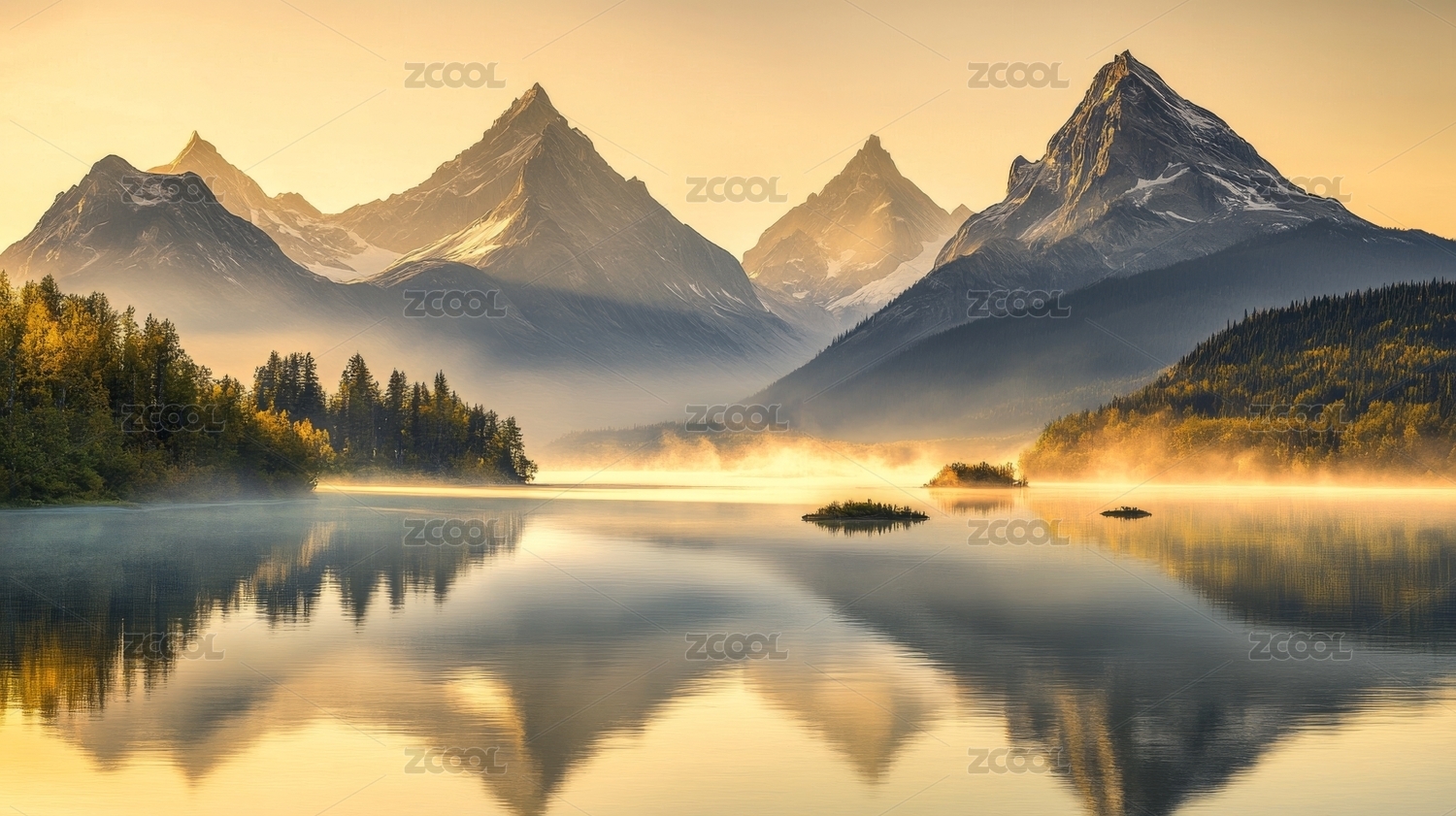 平静湖泊环绕着雾气山林