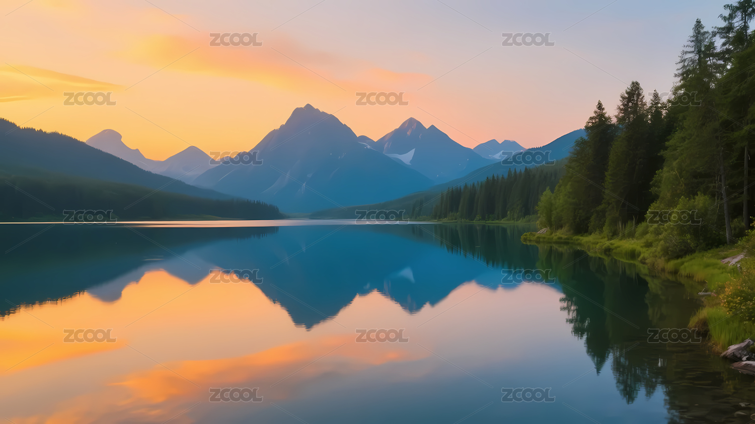 雪山森林和湖泊倒影自然风景插画