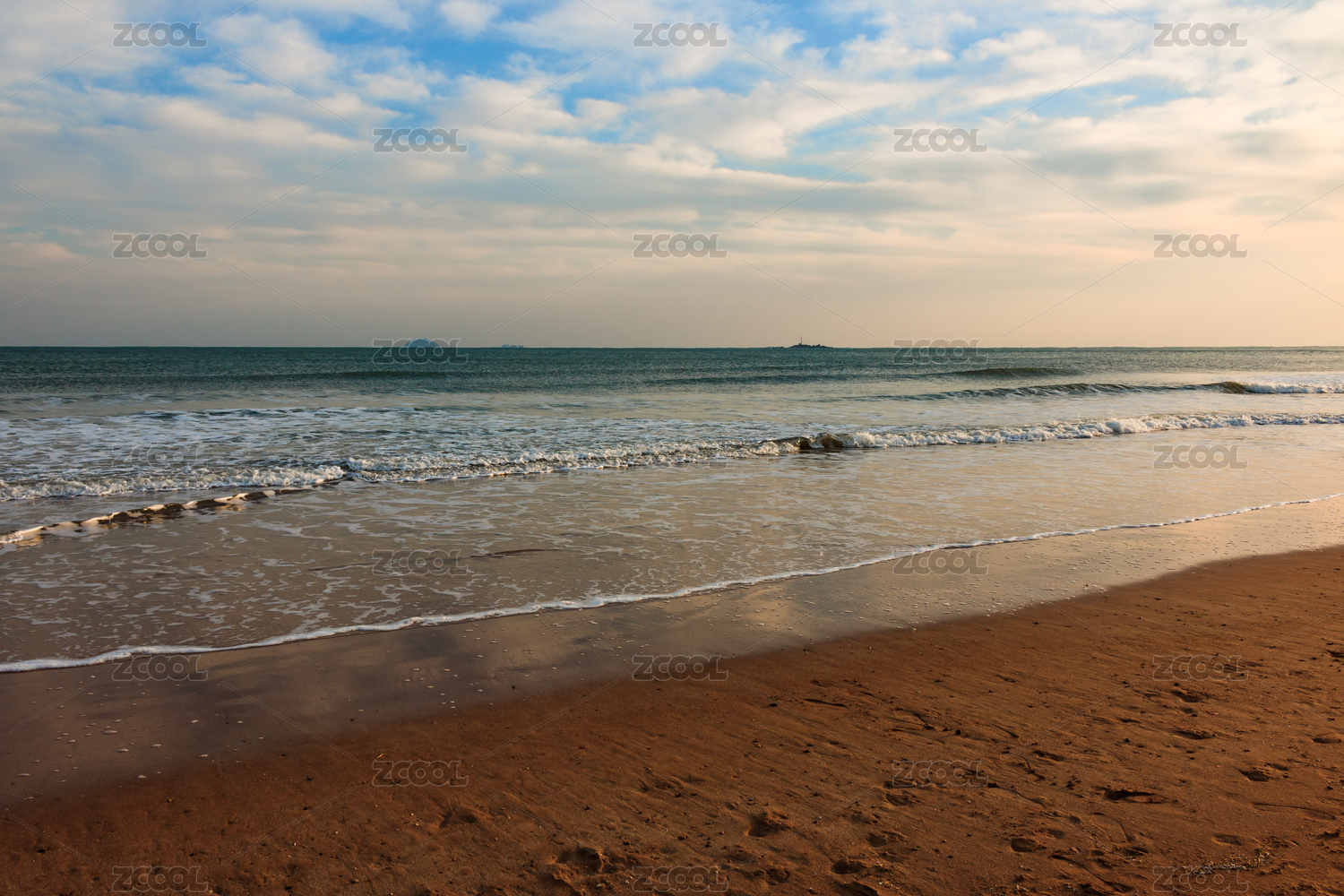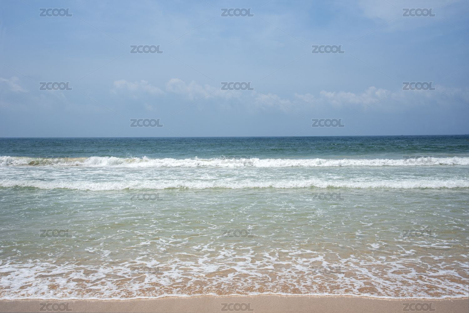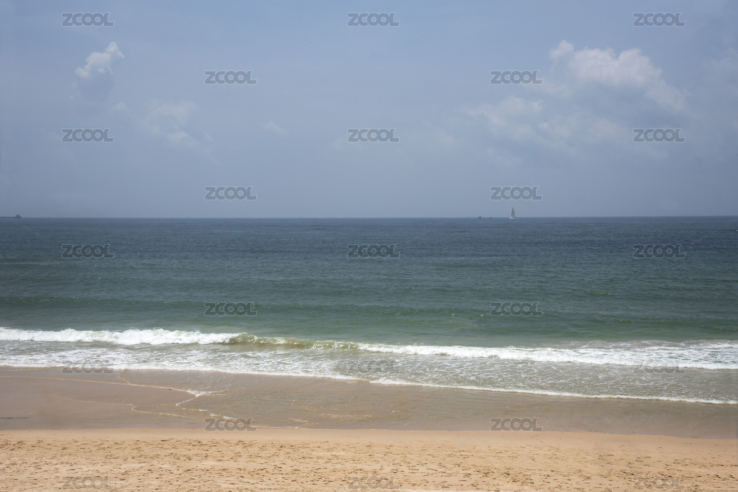 海南博鳌海岸边蓝天白云下的碧波沙滩远景