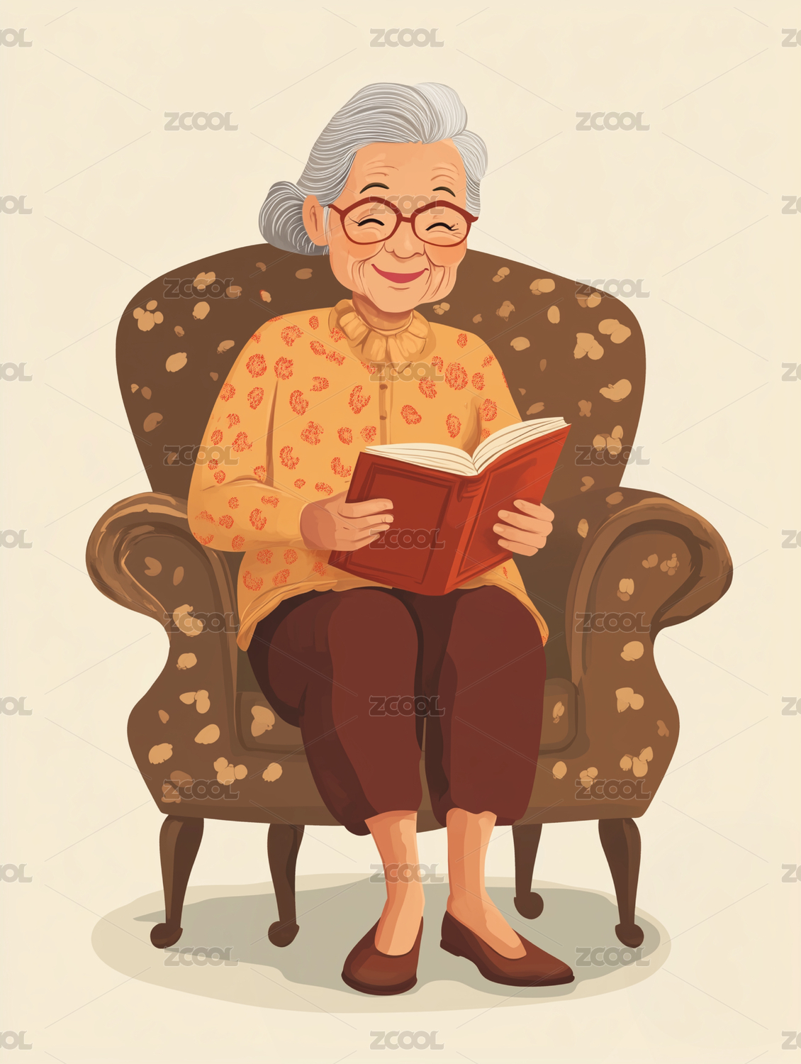 小清新风格,独居老人,沙发,织毛衣,插画,元素,黑猫,老人,老太太,重阳节