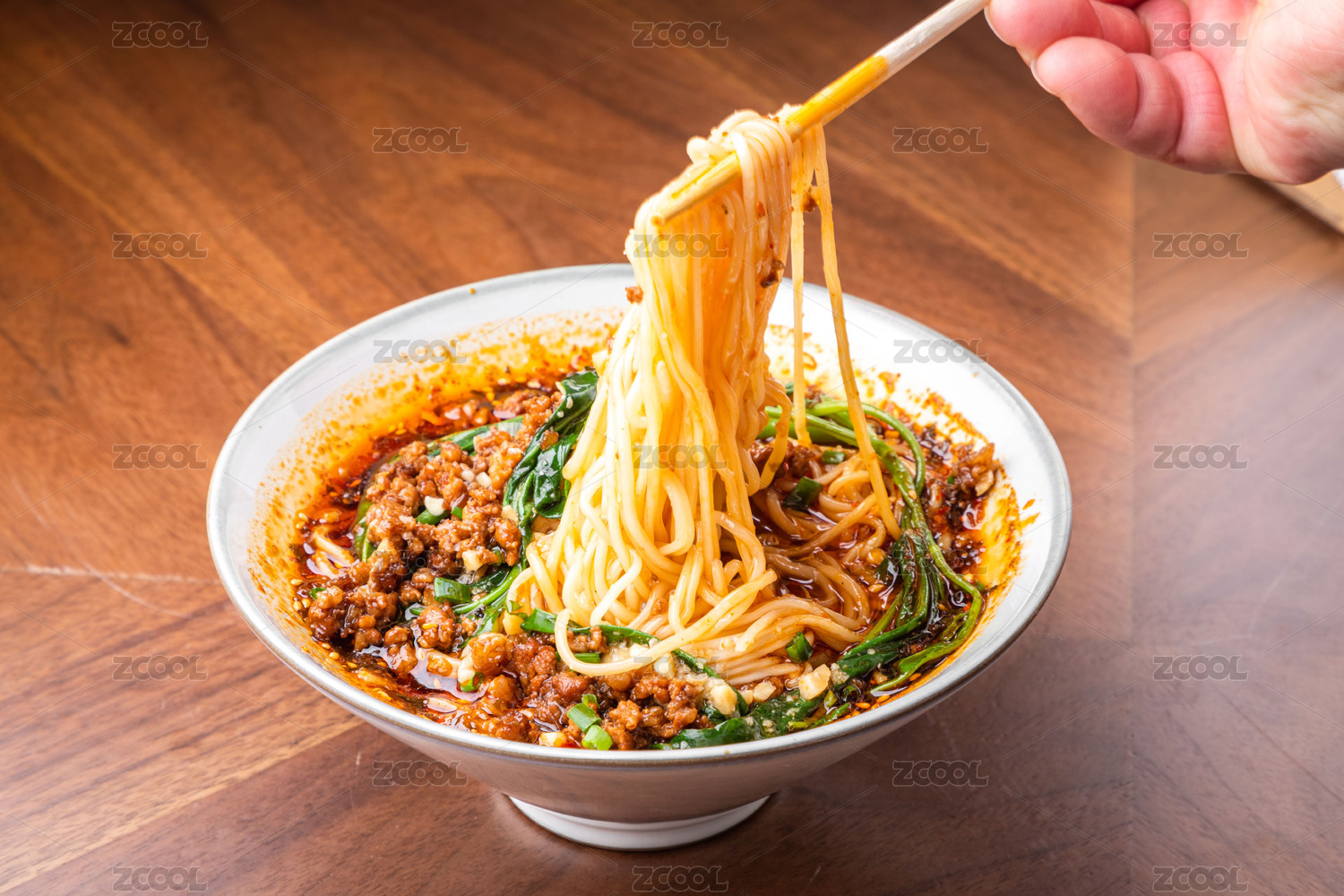 棕色木纹桌面上放着一碗重庆小面