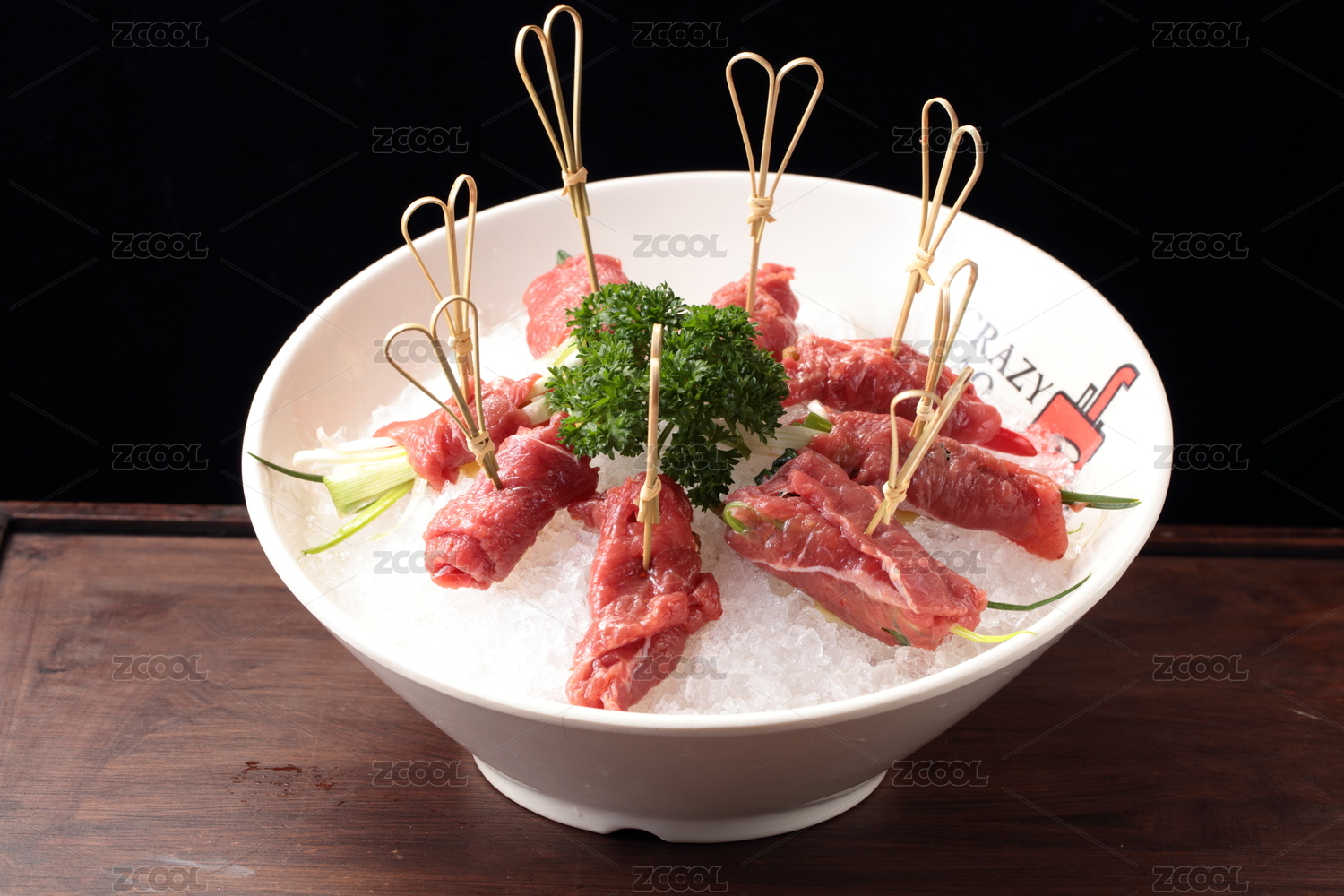 白碗里的火锅菜品竹签串着冰鲜嫩牛肉卷香葱