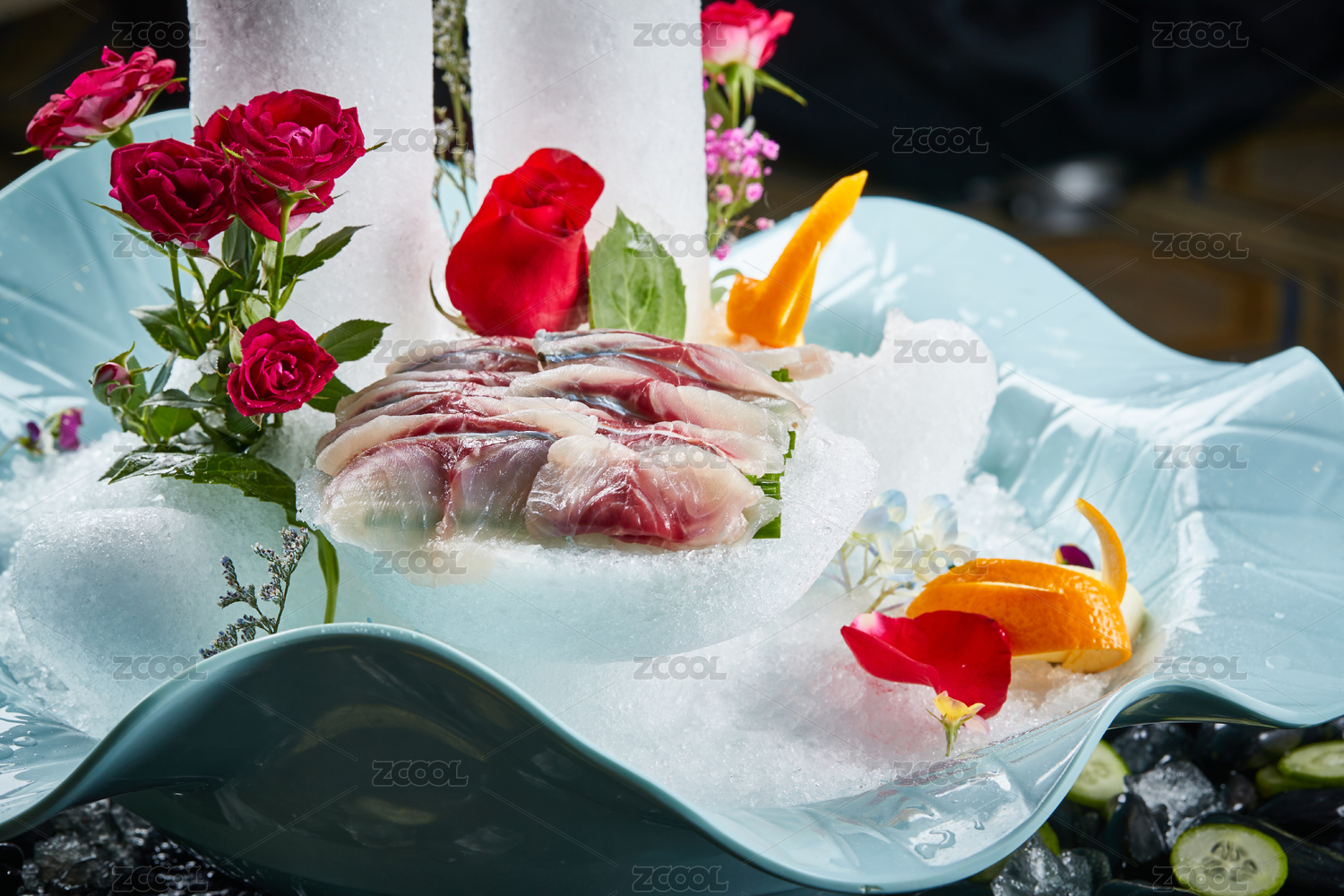 干冰缭绕的荷叶青釉瓷盘装的仿唐宴鱼脍(生鱼片)
