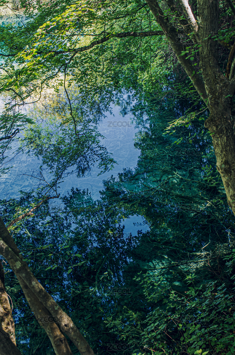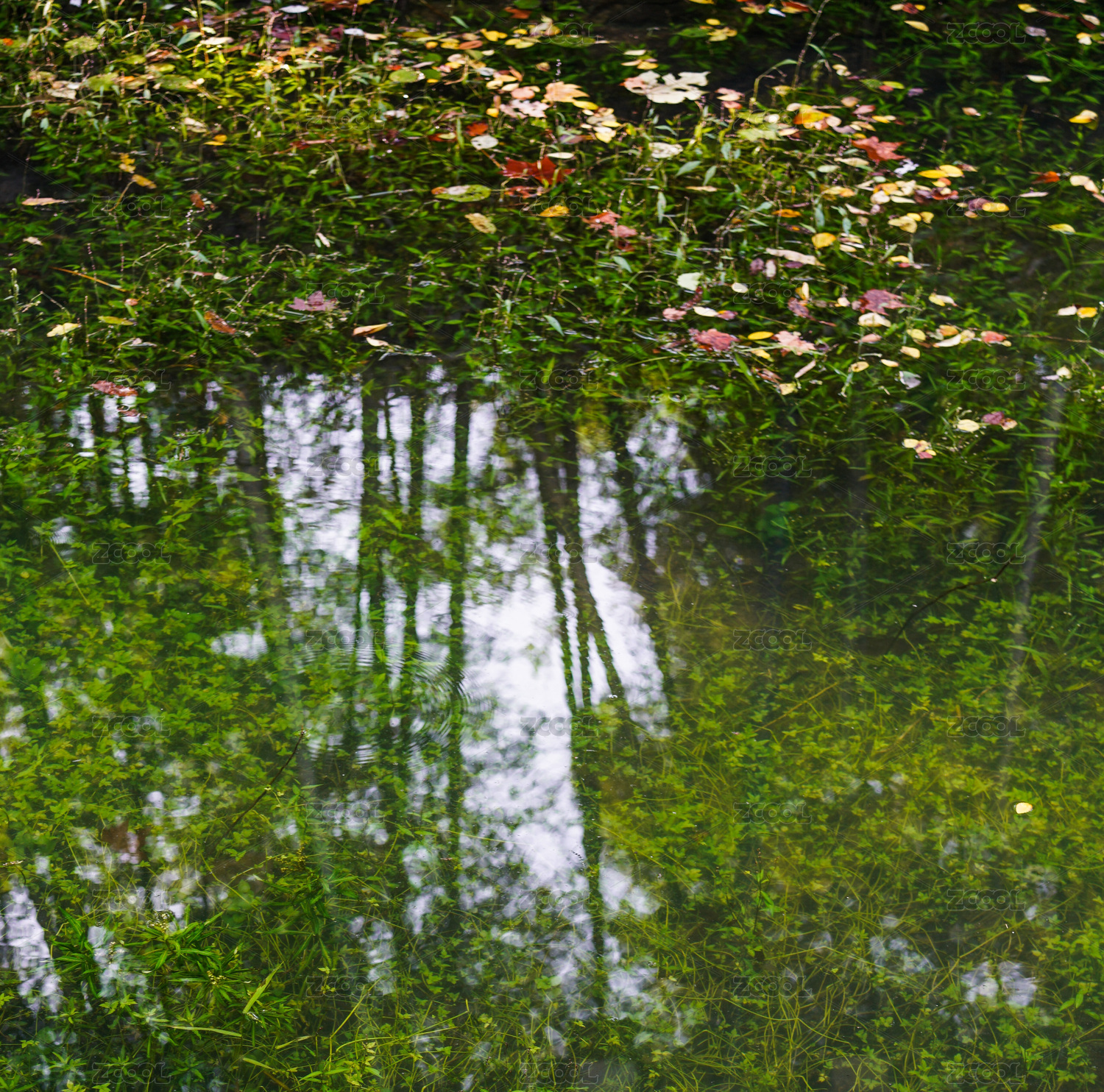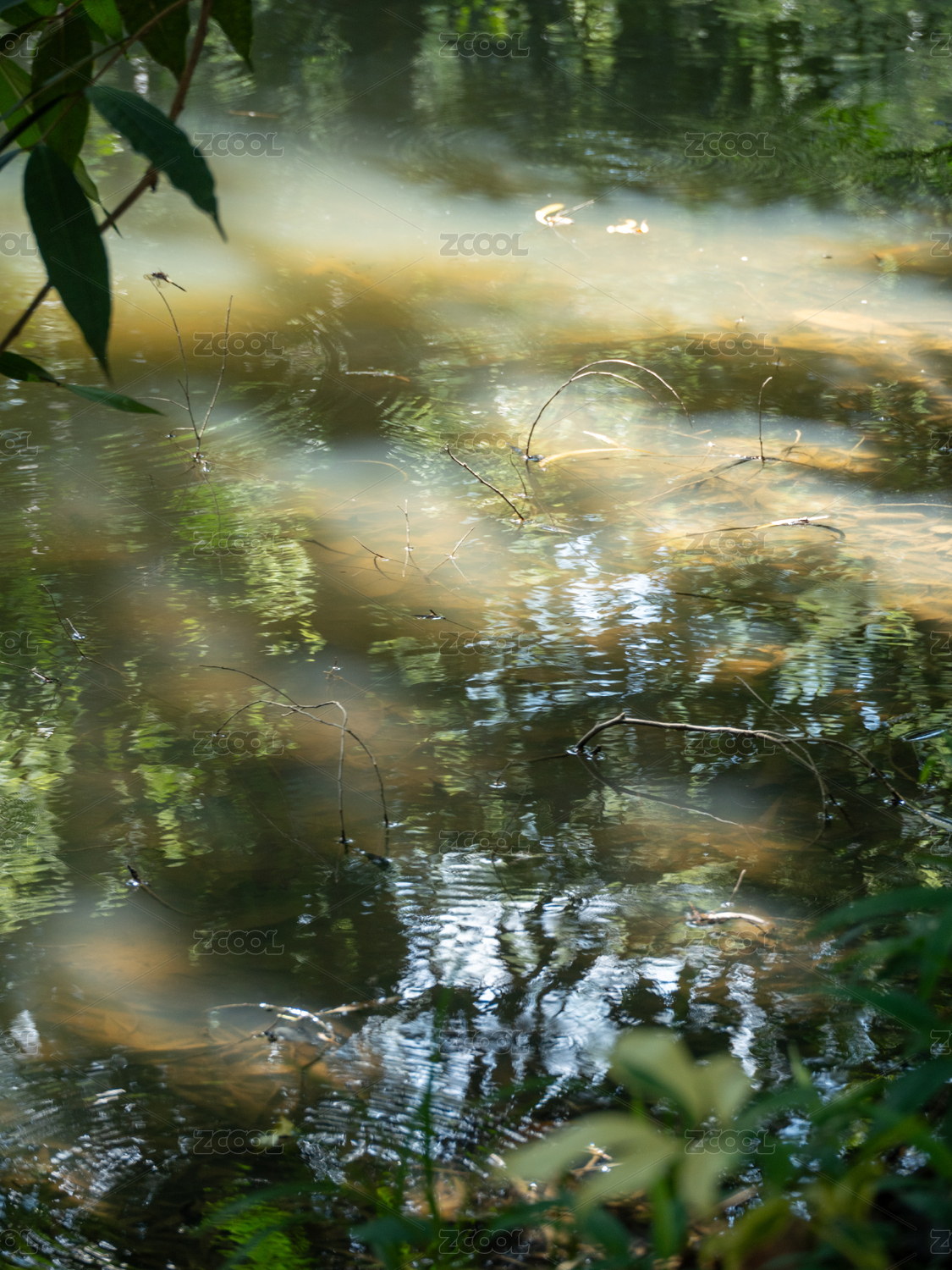 池水,水,水边,薄雾,绿色,植物,茂盛,局部,迎春花,植株