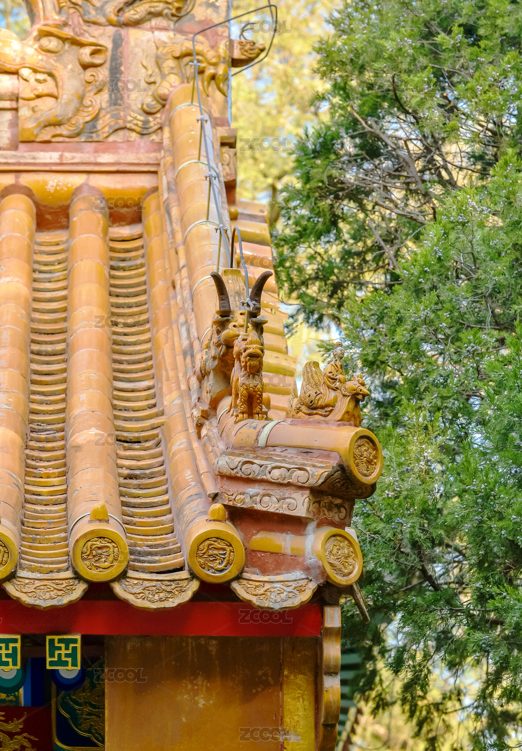 北京故宫宫殿古建筑红墙黄色屋檐局部特写