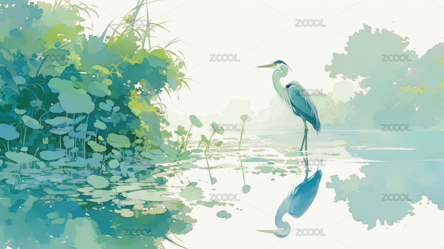 湖边美丽的苍鹭日本浮世绘艺术