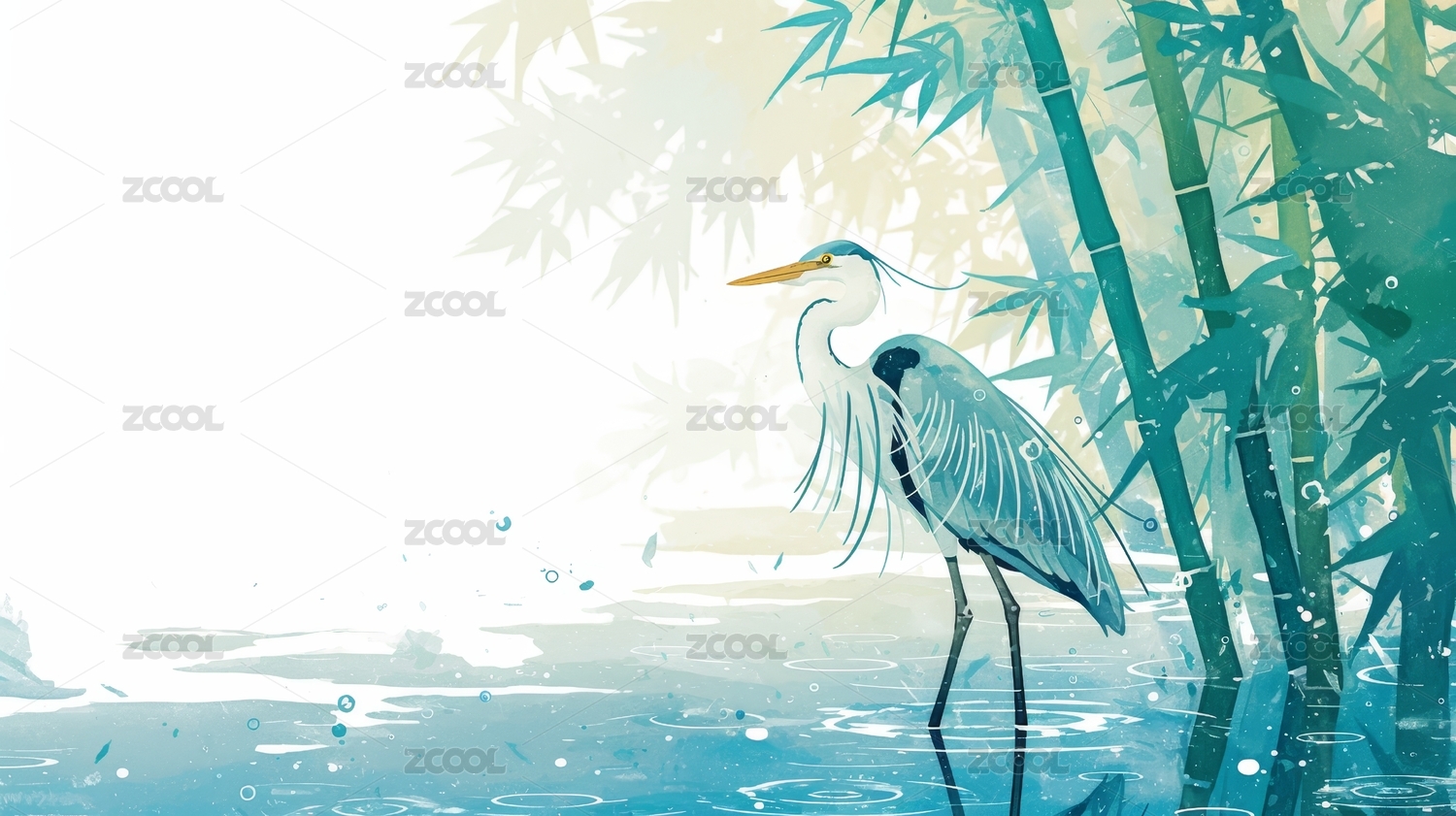 翠竹水畔立孤鸟