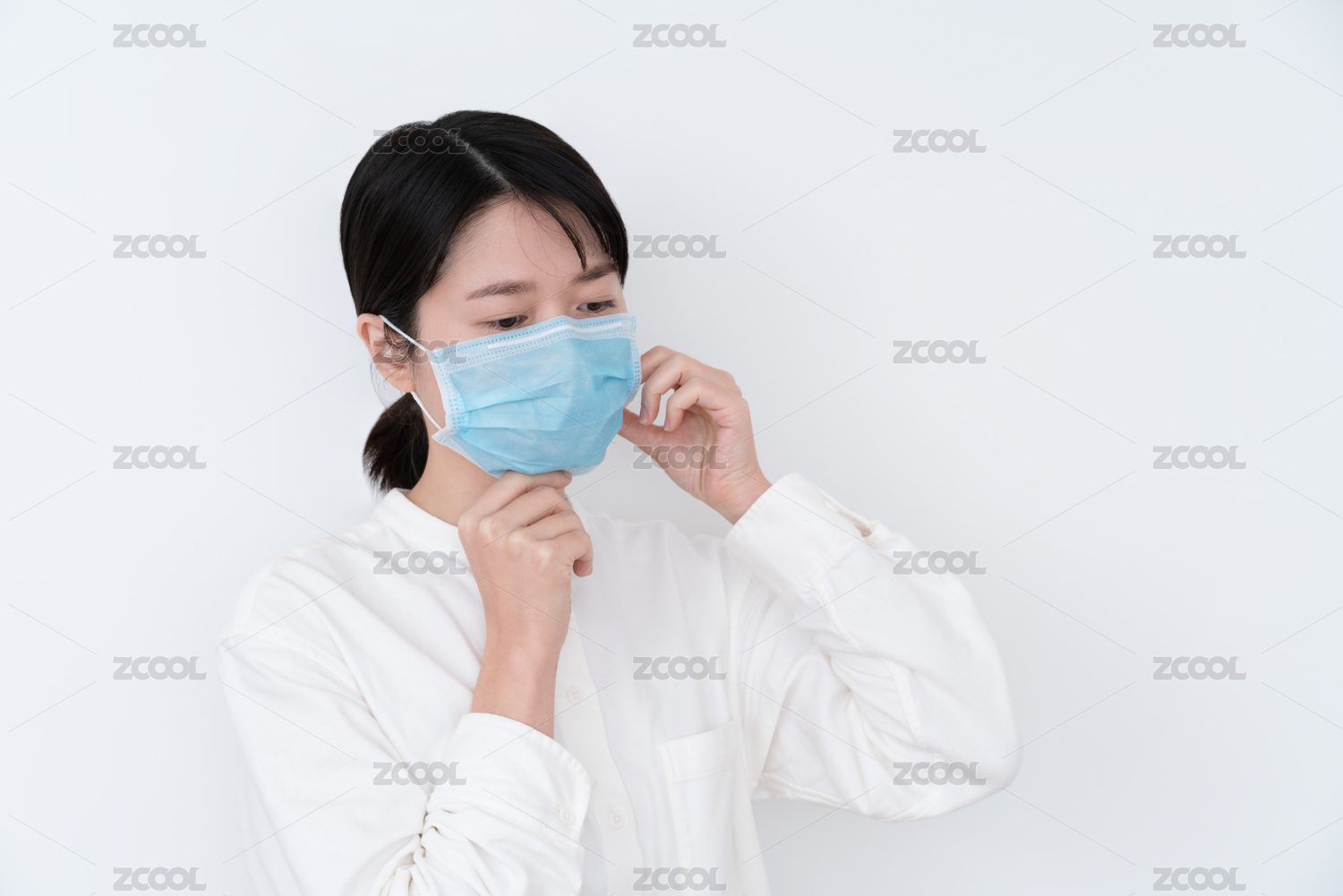 穿白衣服的亚洲东方女生正在戴一次性医口罩