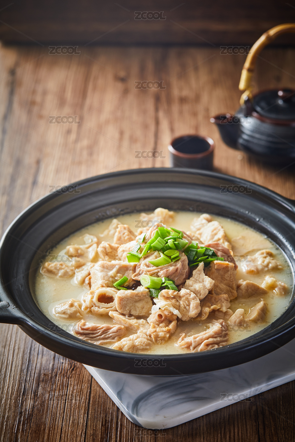 蓝色餐布上有一把砂锅火腿炖土鸡