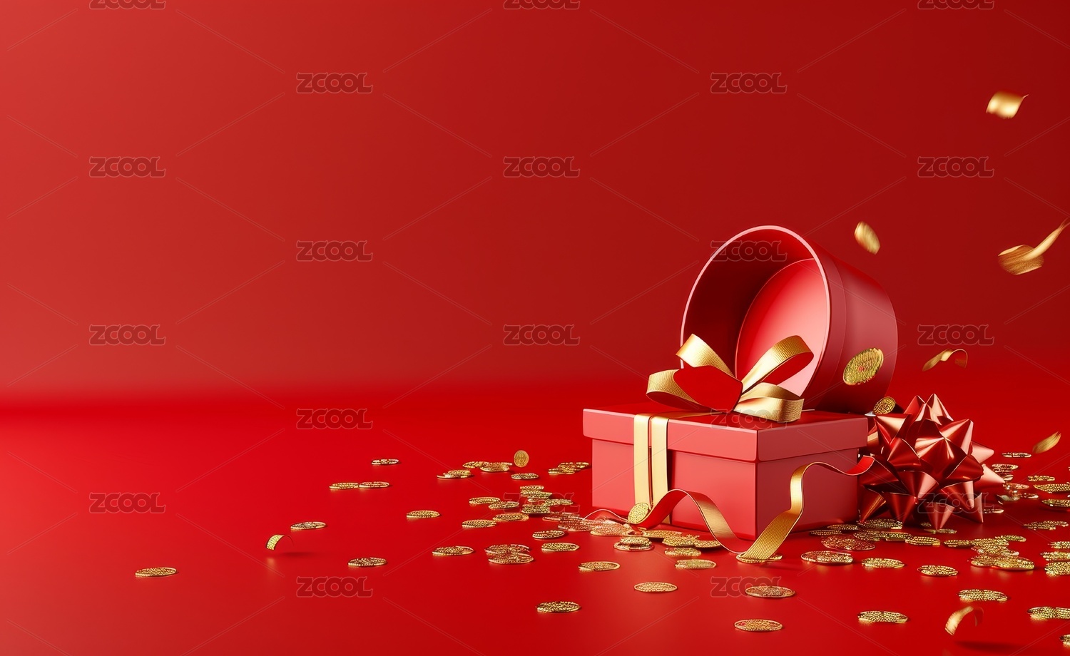 红色礼盒倾洒金色纸屑图