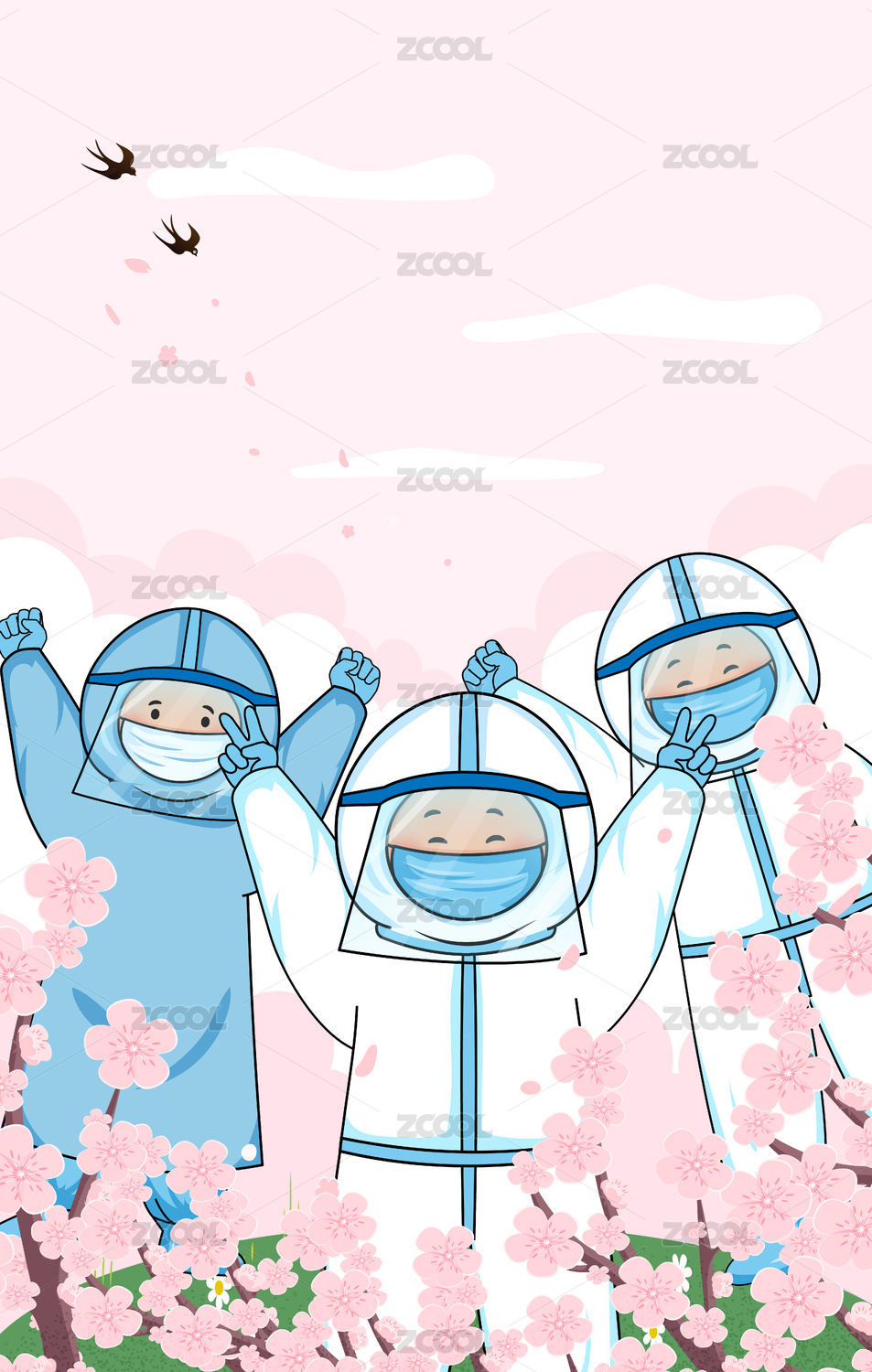 樱花树下三位穿着防护服的医生加油赶走病毒