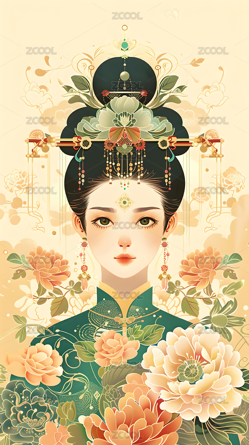 中式国潮风古代服装女人半身头像正面头饰