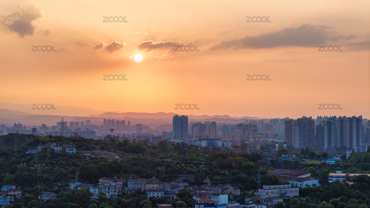 落日余晖下的西双版纳城市剪影