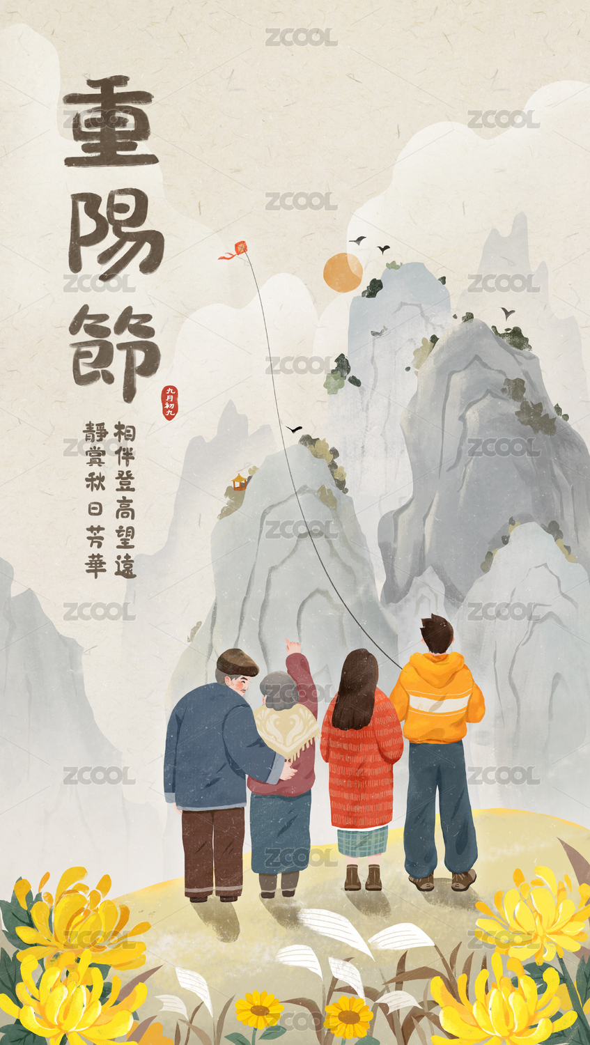 重阳节红色山坡上看风景的母女温馨插画竖版字