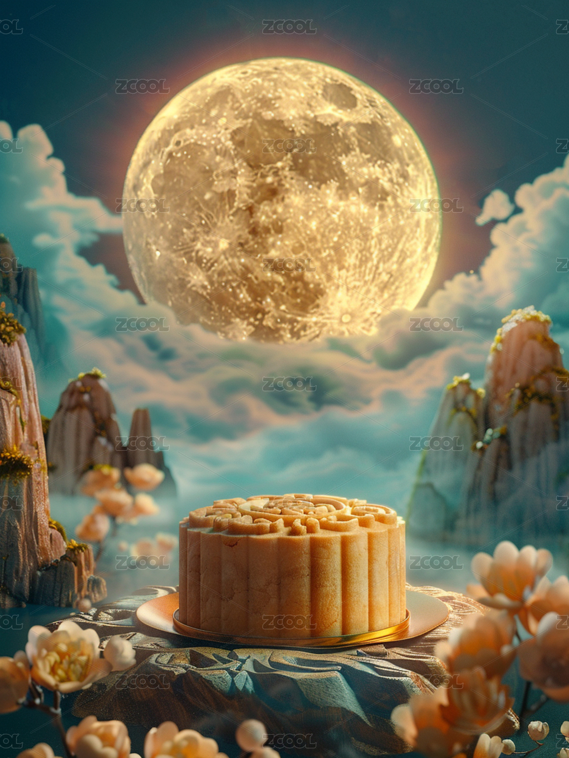 中秋,月饼,赏月,节庆,传统,树,云,山,花