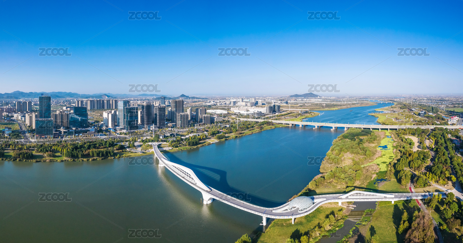 绍兴市上虞区曹娥江人行桥和江滨城市风光
