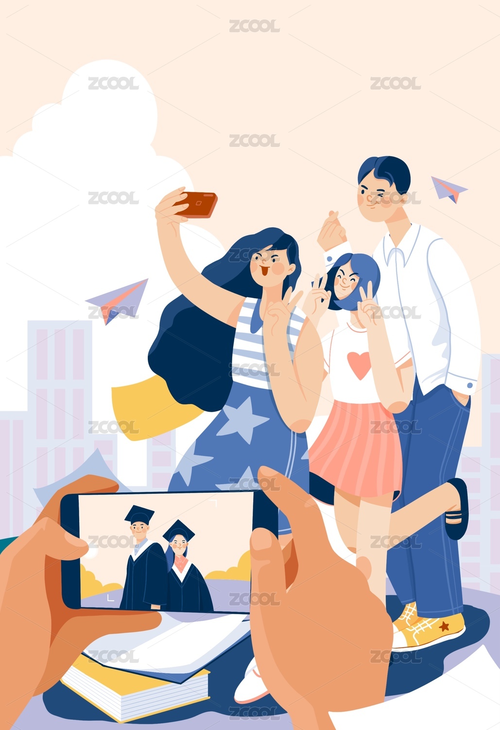 原创扁平毕业季学生拍照留念插画