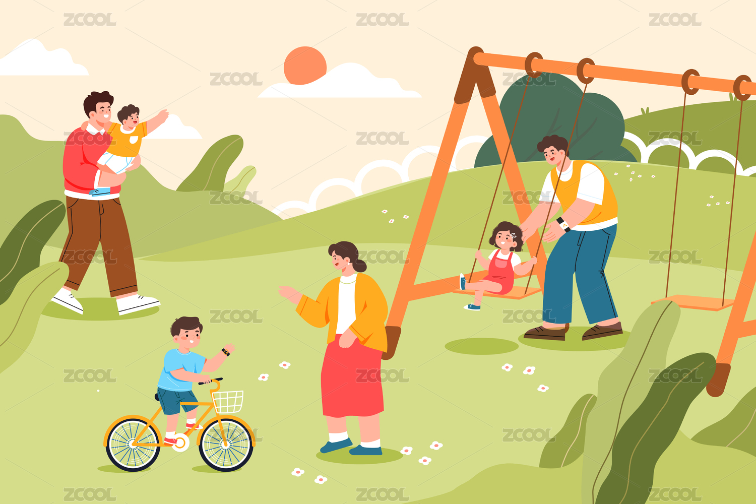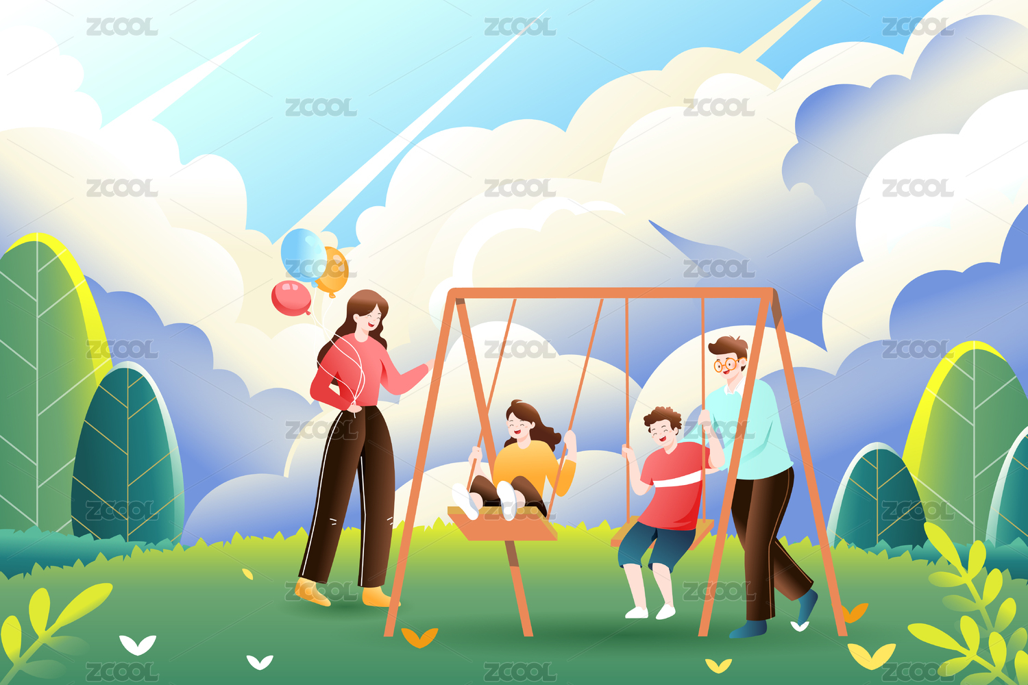 亲子户外玩耍荡秋千矢量插画