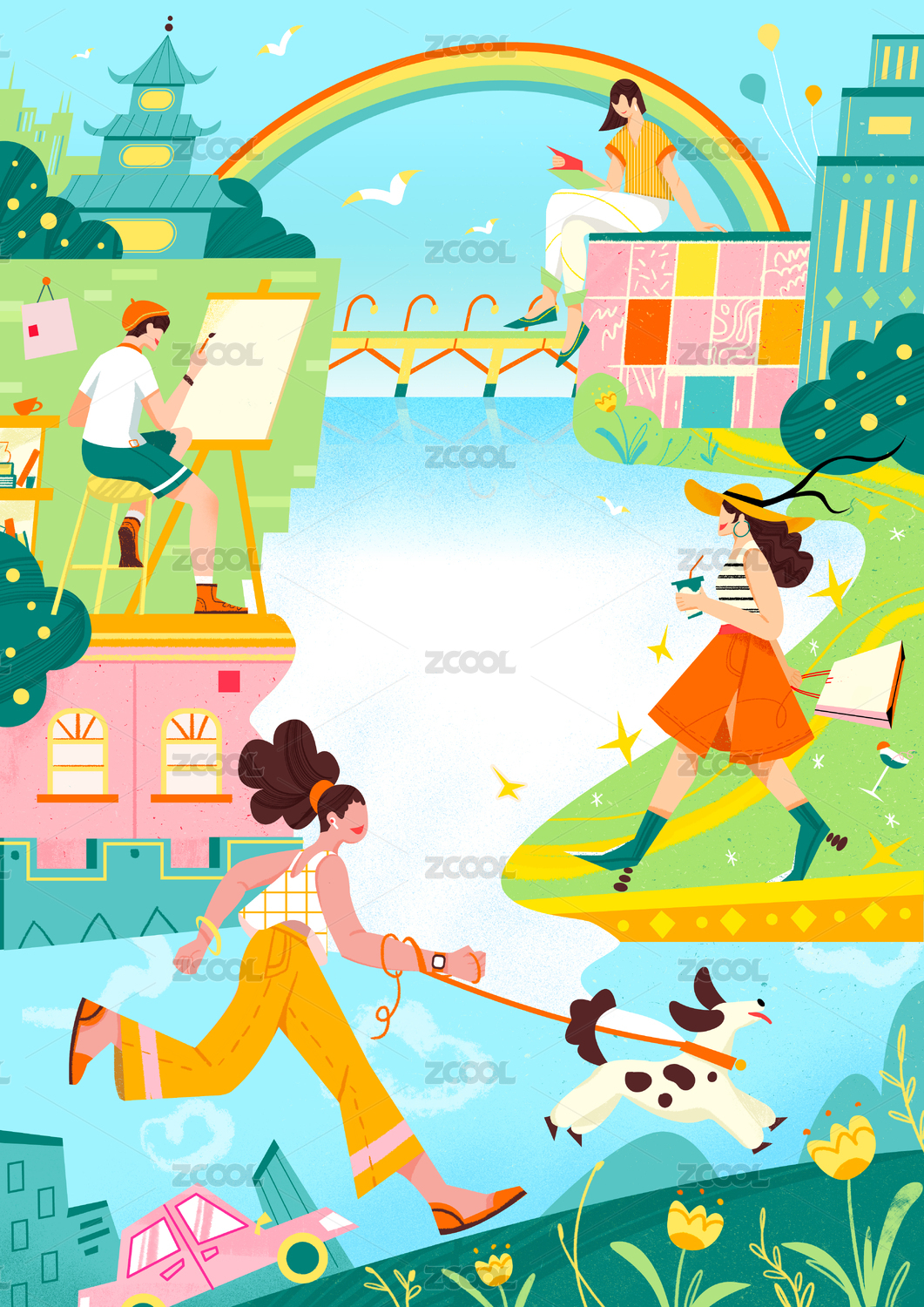 扁平户外时尚休闲娱乐城市青年购物插画设计