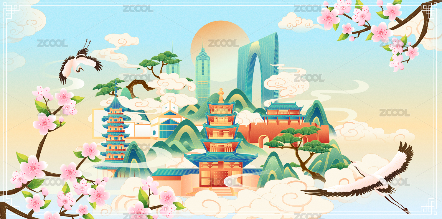 建筑,旅游,城市,风景,桃花,仙鹤,祥云,城市天际线,地标,旅行
