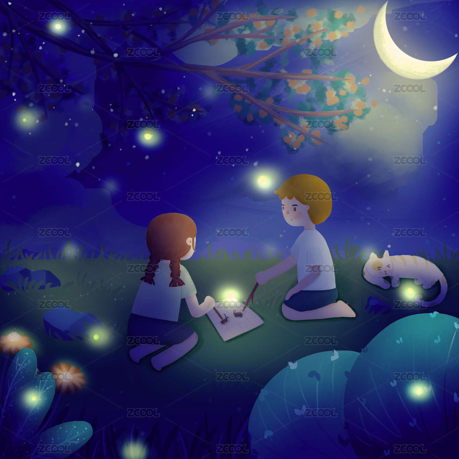 手绘卡通唯美的夜晚看星星的孩子儿童节插画