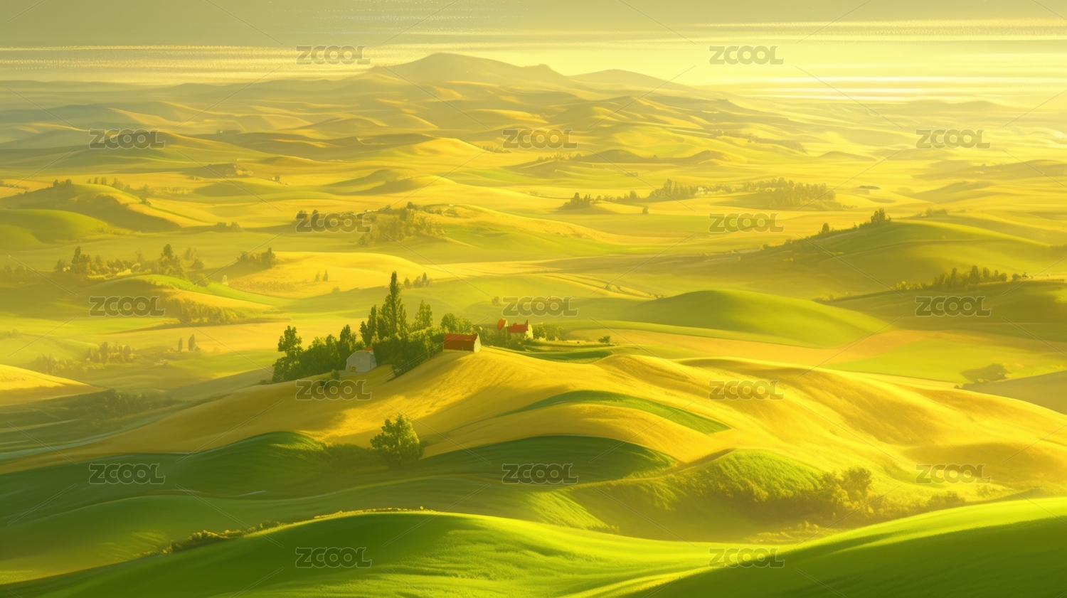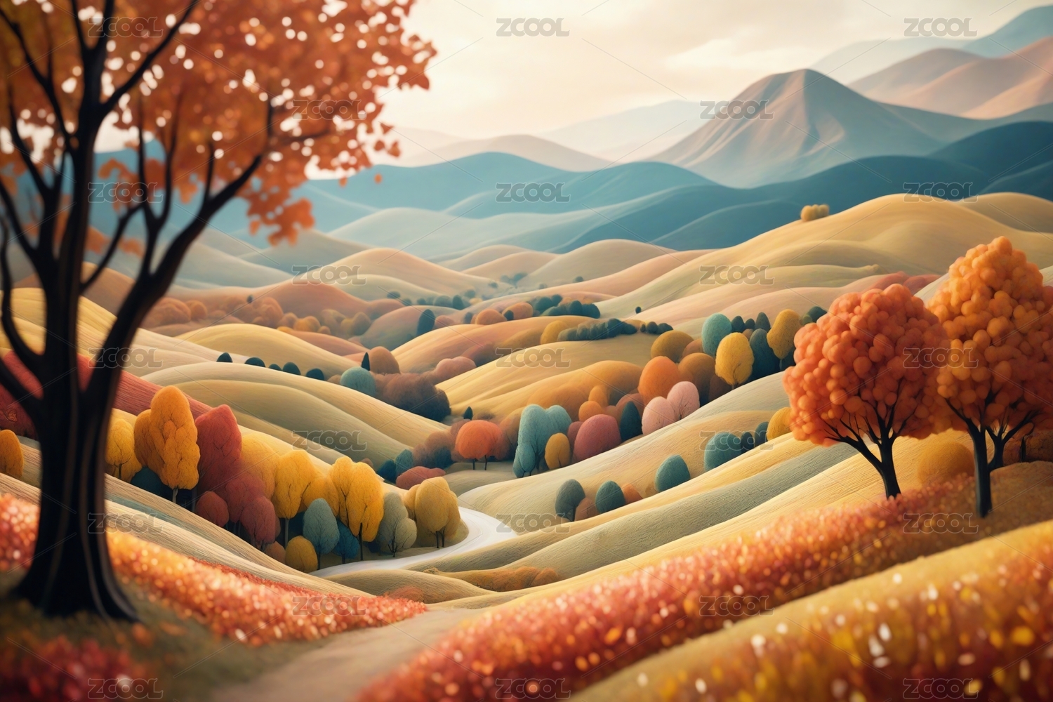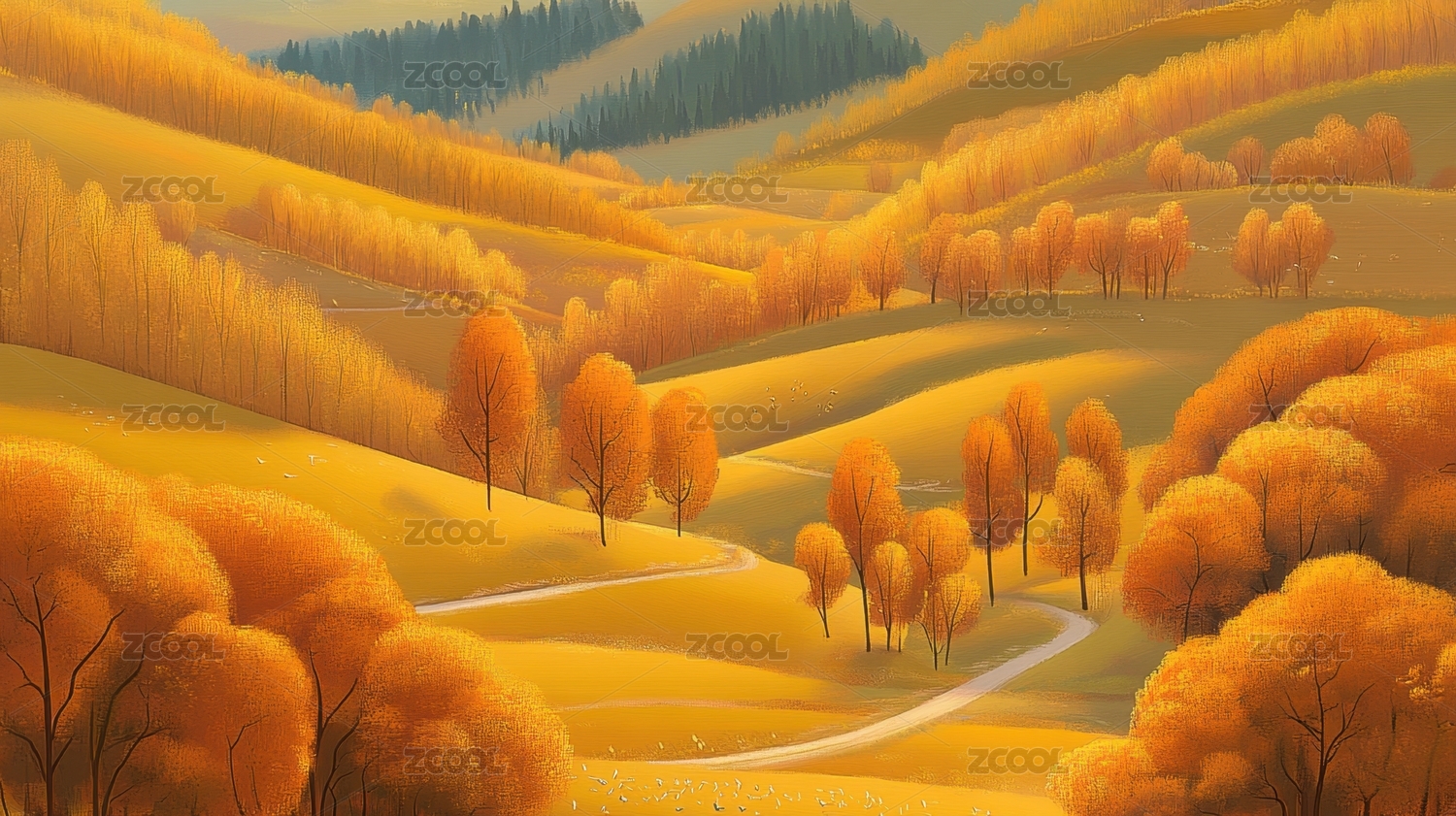 秋日,山丘,树木,草地,云朵,阳光,风景,画作,色彩,金黄