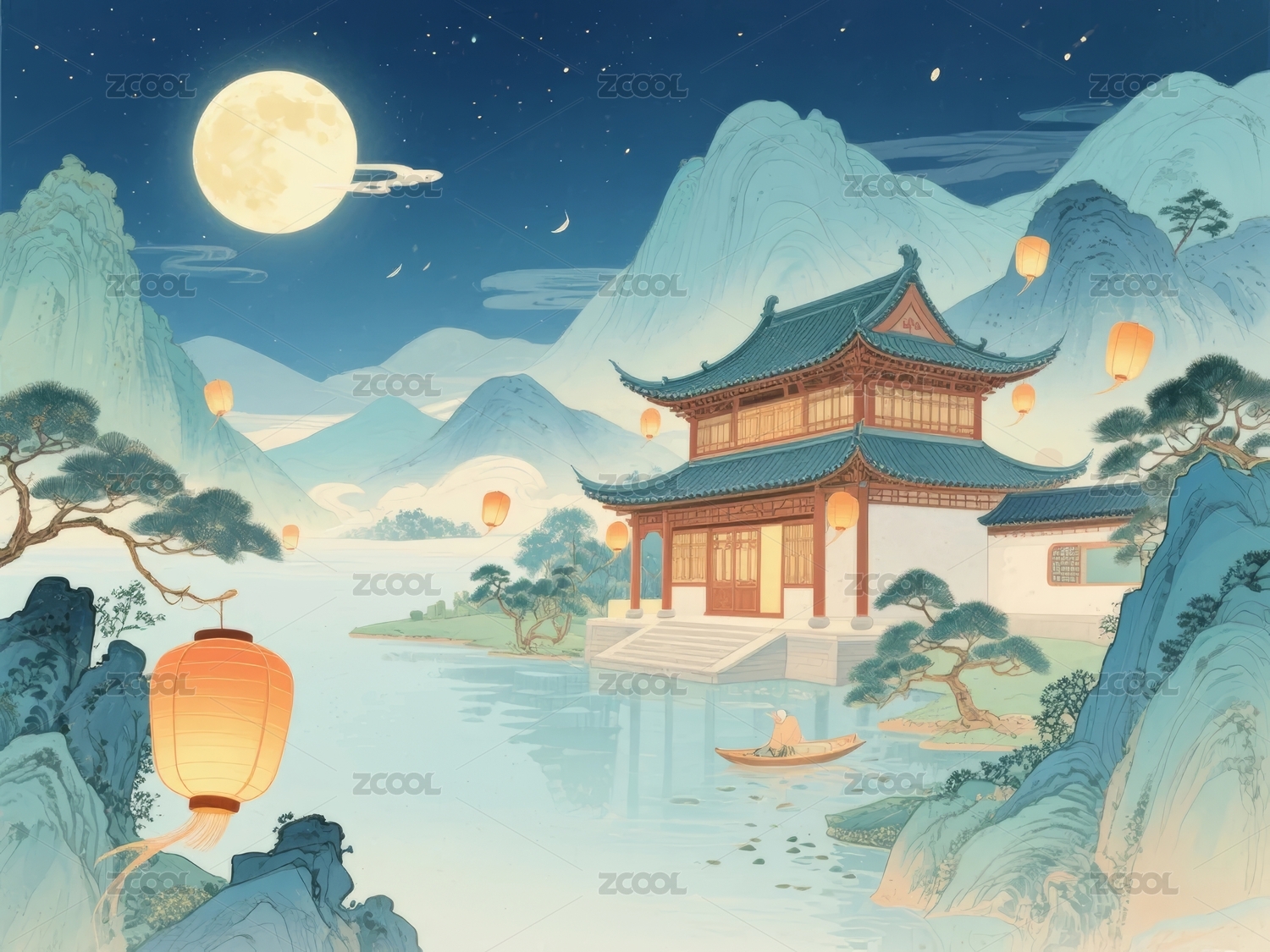 山水,月亮,湖泊,船,人物,传统,建筑,倒影,夜景,宁静