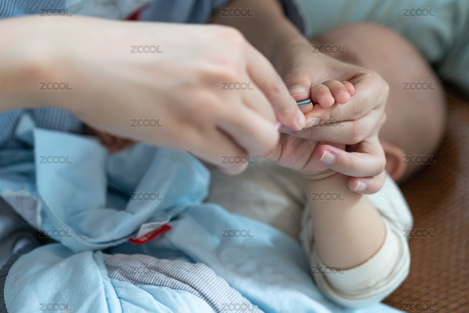 母亲为熟睡中的孩子剪指甲