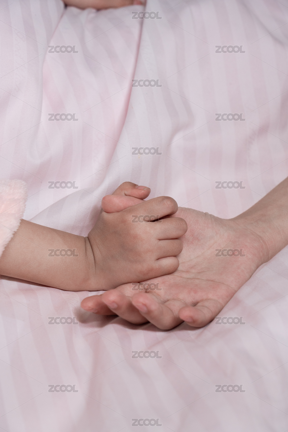 亚裔小男孩在睡觉,拉着母亲的手指