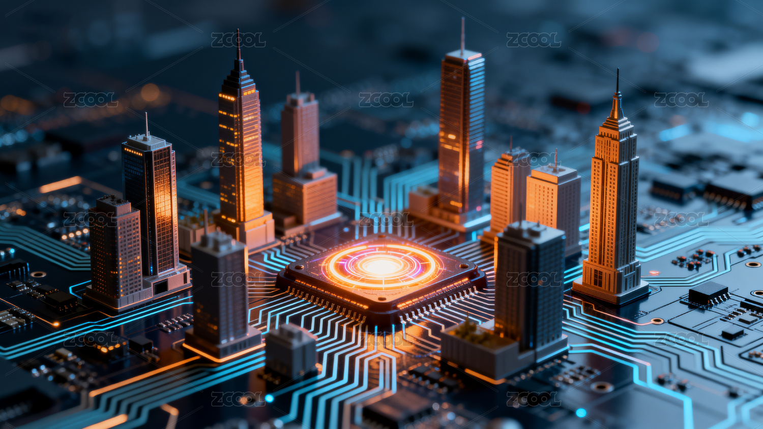 3D科技城市芯片创意背景