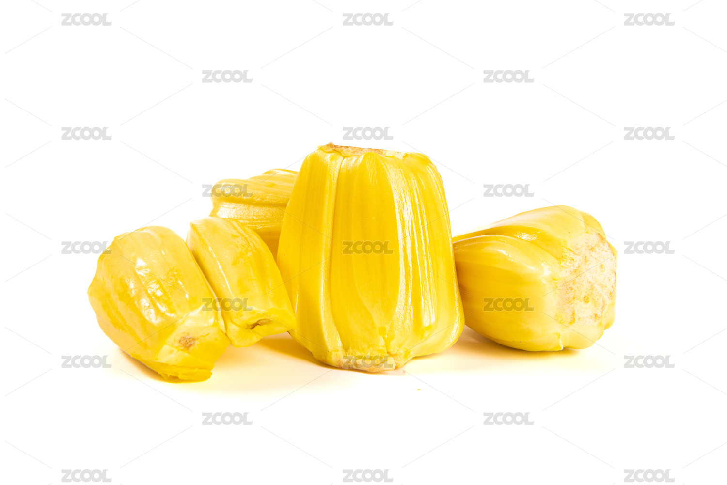 白色背景上摆放着金黄色的菠萝蜜果肉