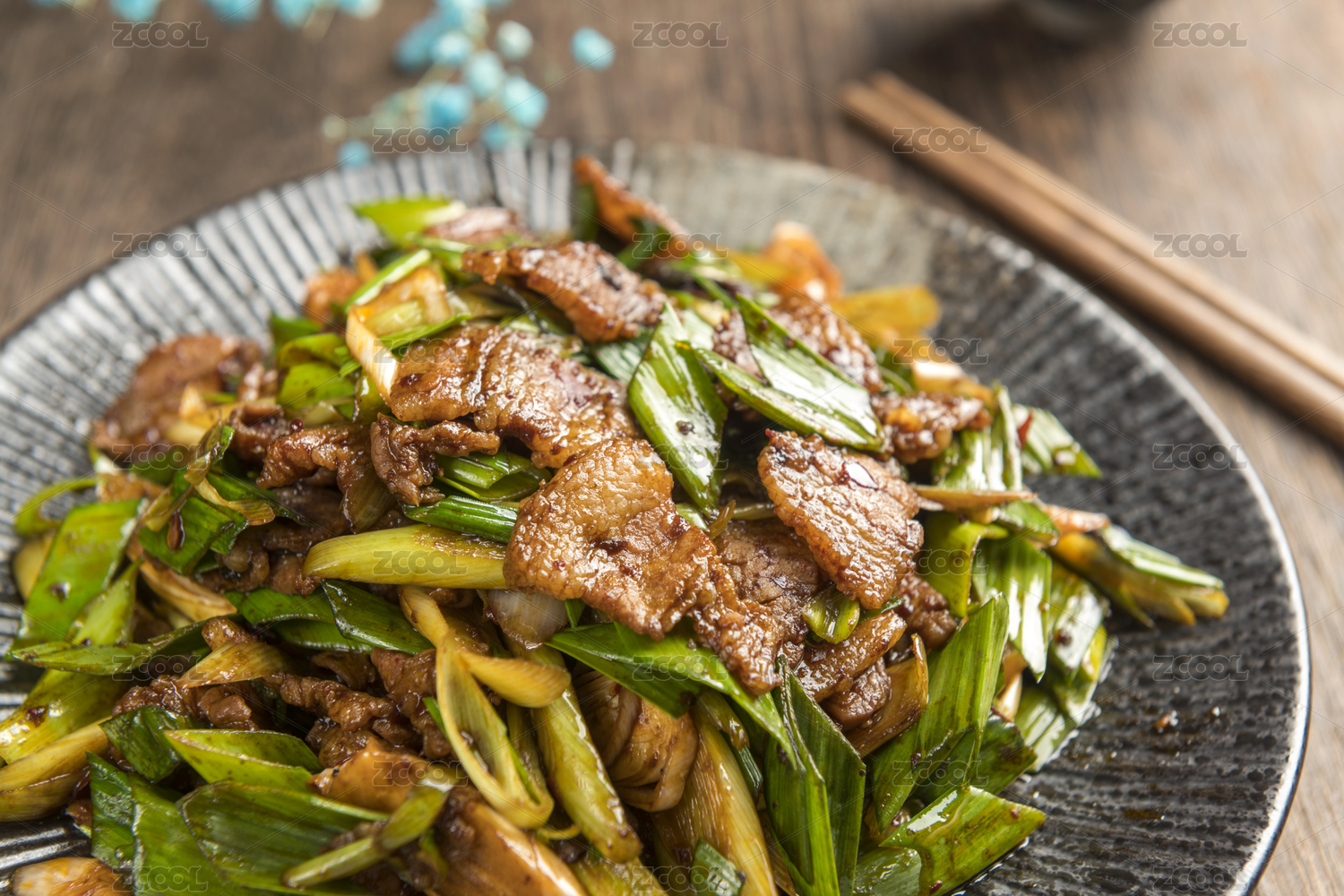 传统鲁菜家常菜葱爆肉摆放在木桌面上特写