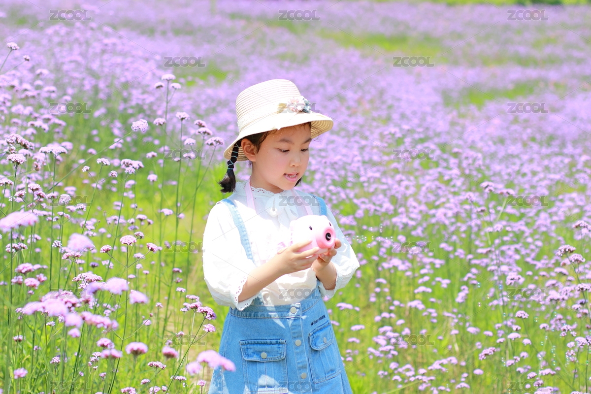 在紫色马鞭草花海中玩耍的小女孩