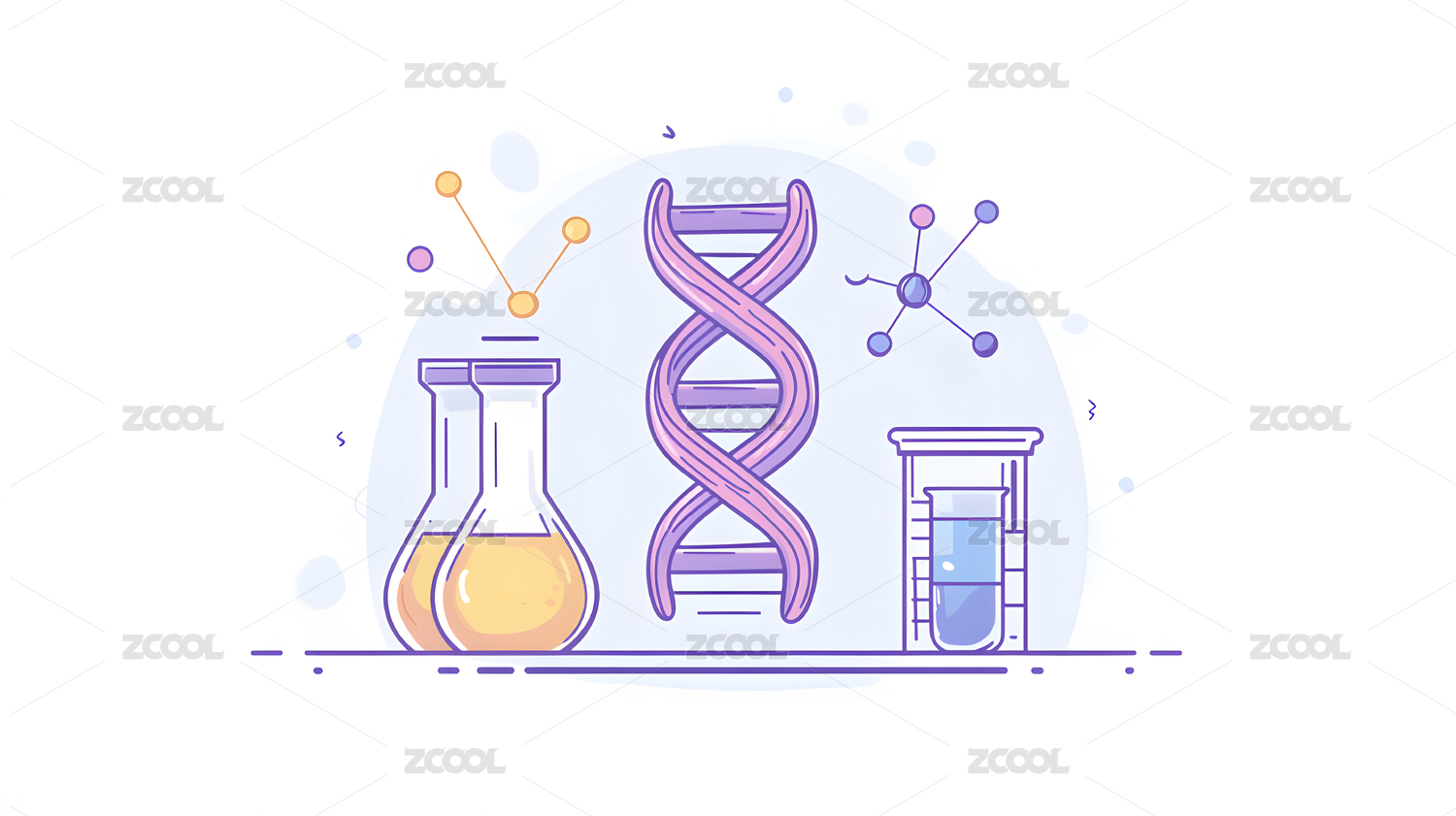 彩色 DNA 双螺旋结构旁摆放着几个实验