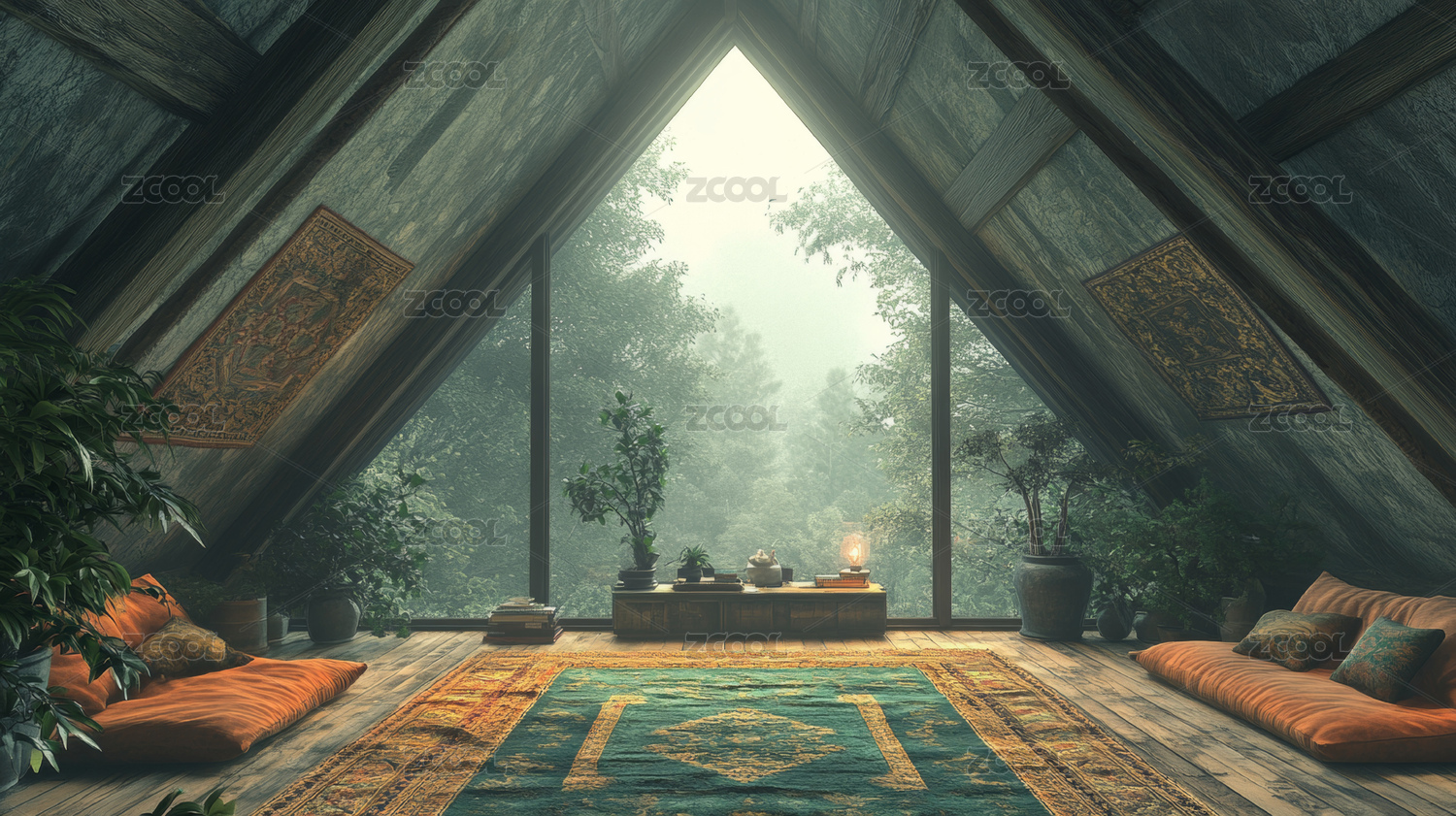 木制小屋里的惬意氛围,雾气缭绕的森林