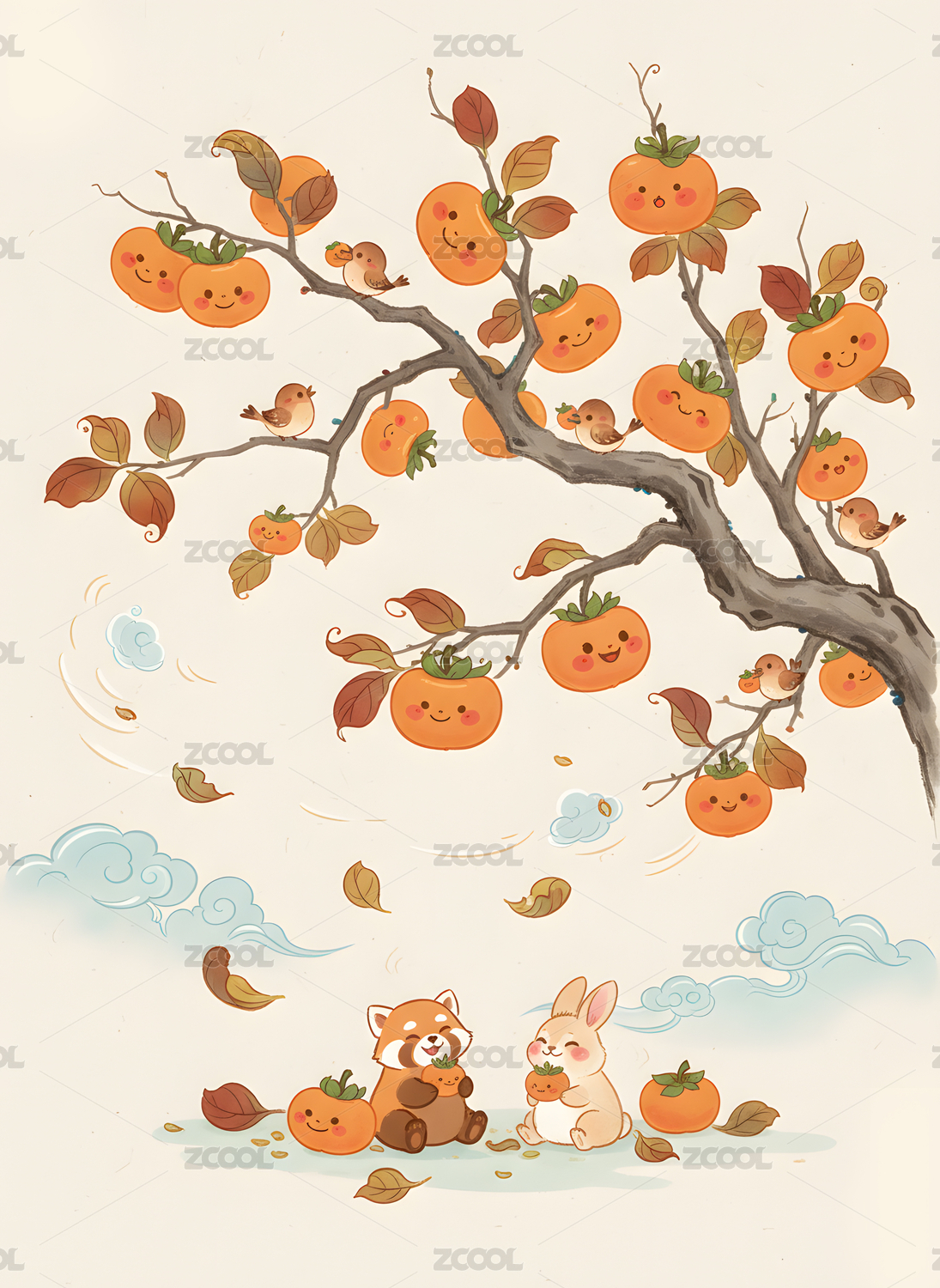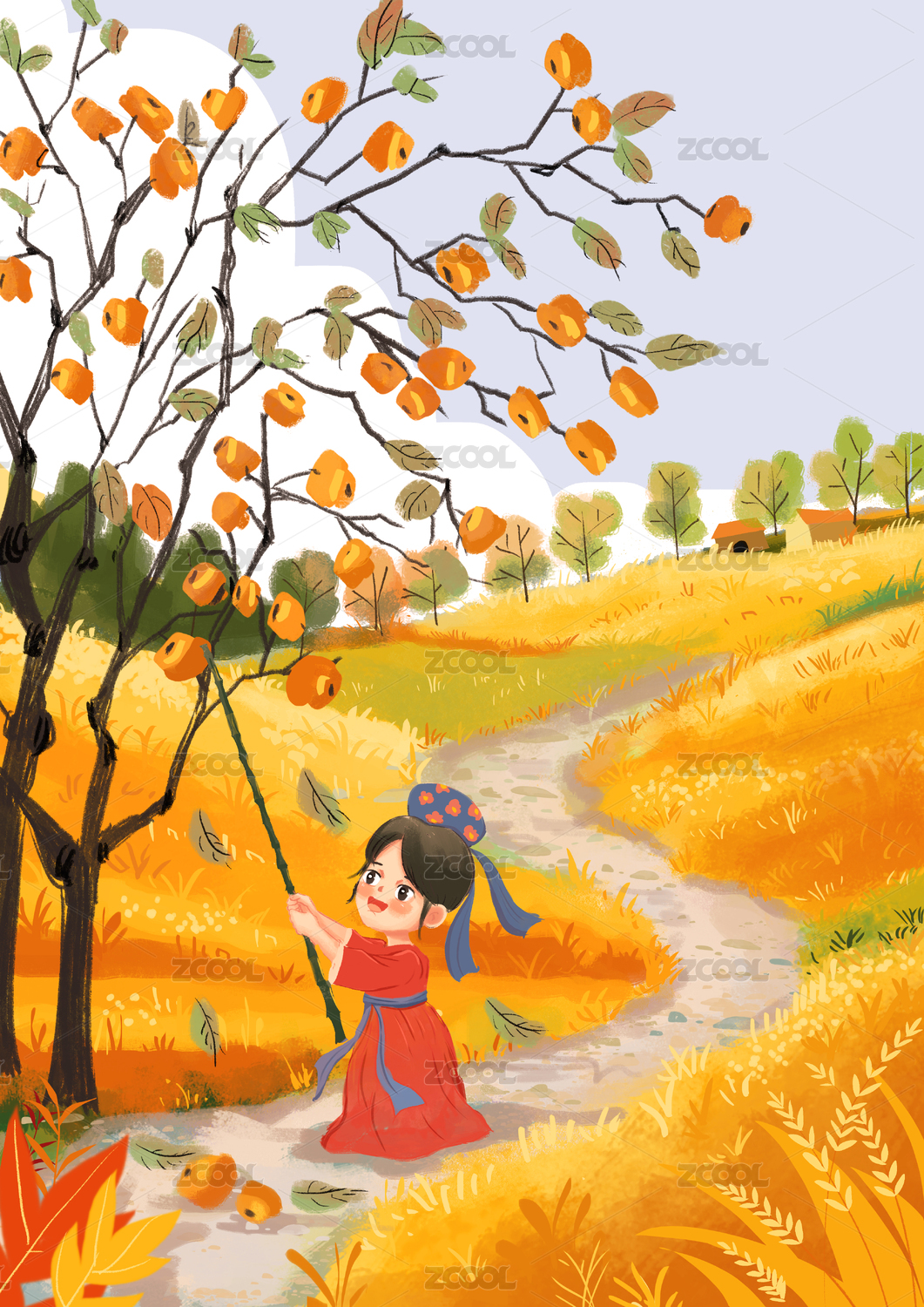 秋天摘柿子插画霜降节气亲子游采摘果实海报