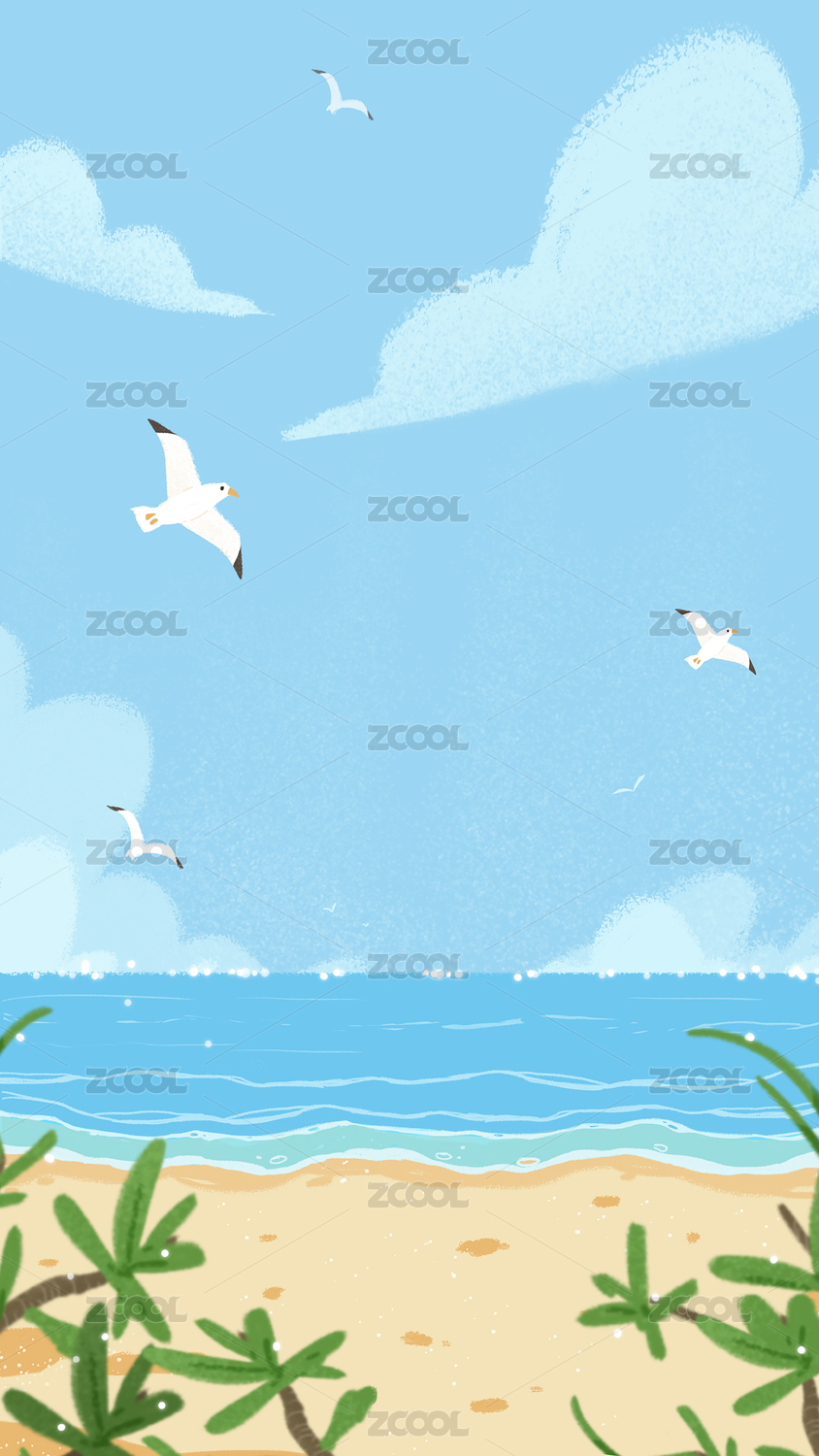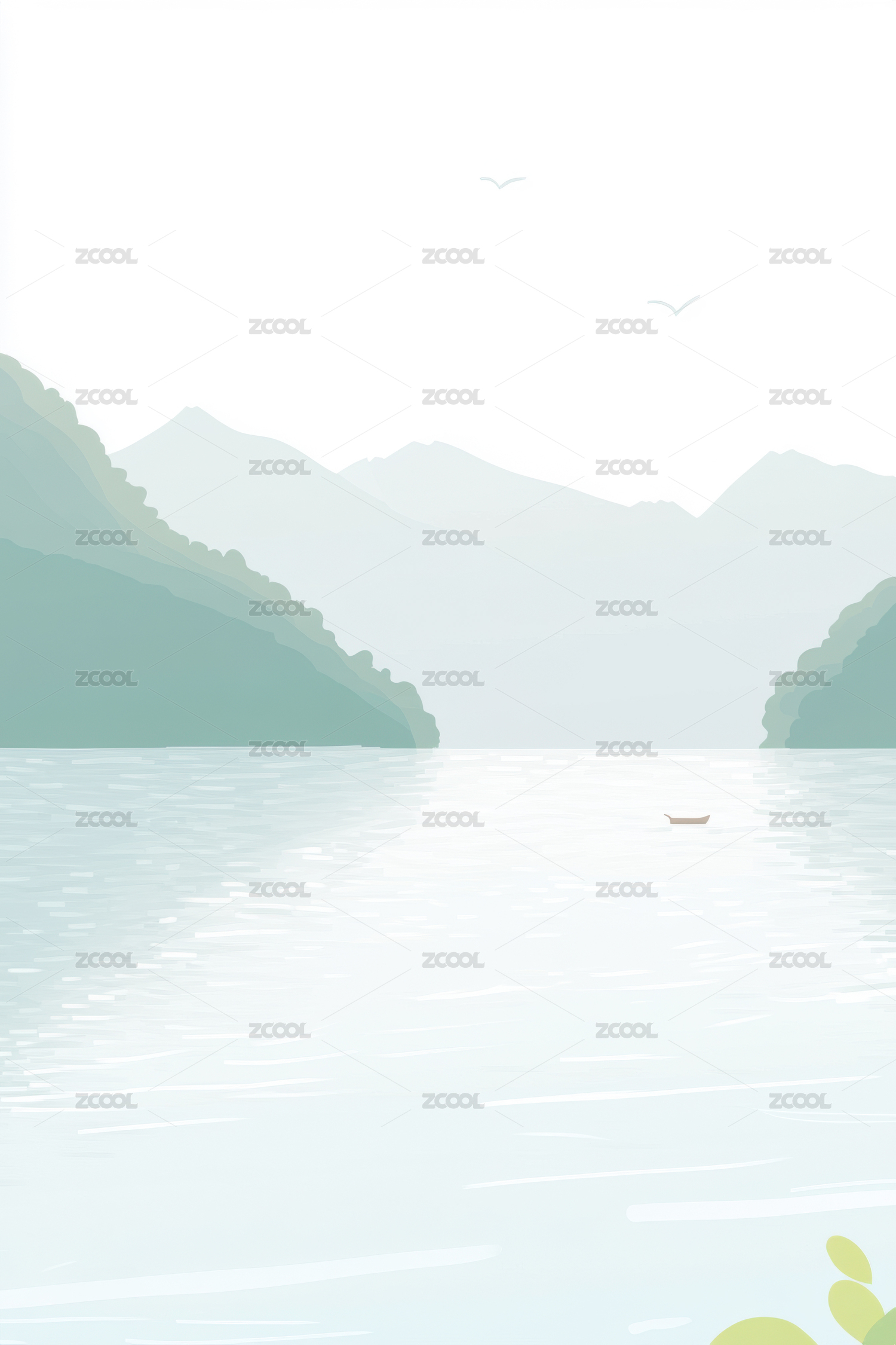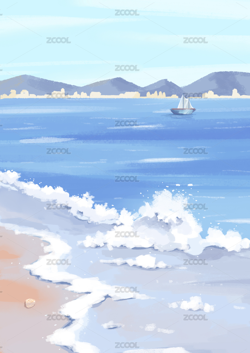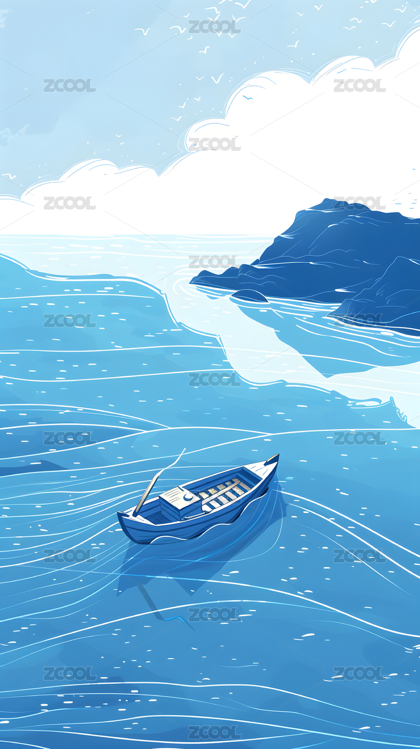 海上,海面,小船,树木剪影,山,云,插画,场景